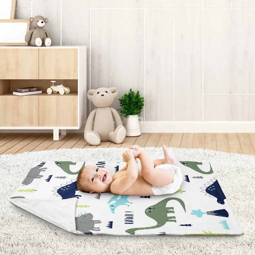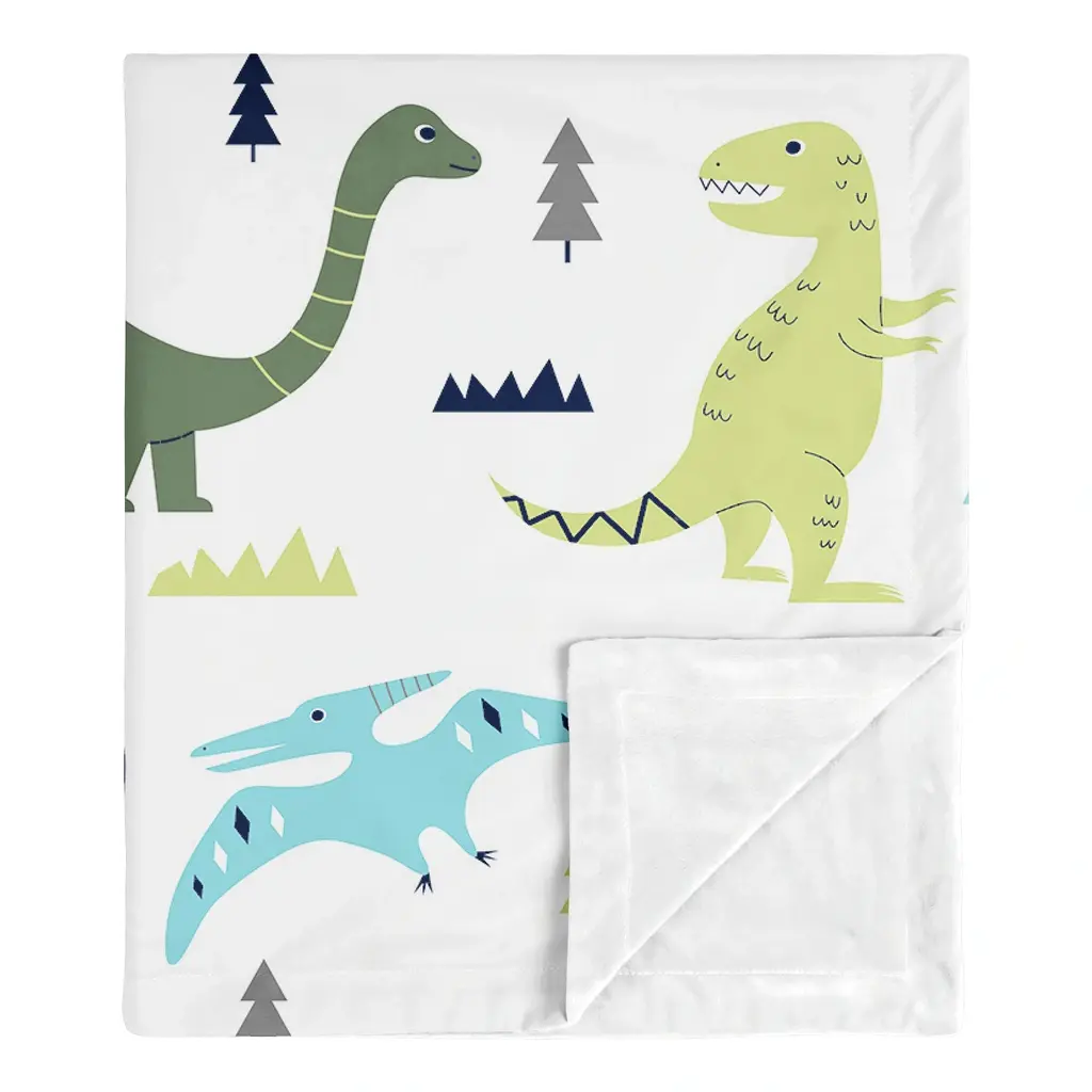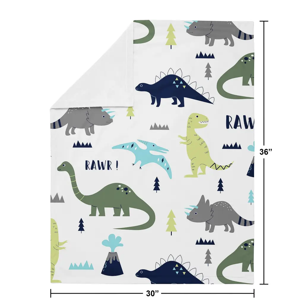 Sweet Jojo Designs baby blankets have an extremely soft feel that's perfect for newborns, infants and toddlers. Soft, snuggly and beautifully made, these blankets feature exclusive patterns and designs and can be used as a security blanket, receiving blanket, stroller cover, car seat cover, or tummy time floor blanket. These lightweight and easy on the go blankets are a must have for any parent or nursery and make the perfect baby shower gift. Don't forget to get an extra back up blanket so your little one can still have their "lovey" even when it needs to be washed. 30in. x 36in. Blanket is designed using a navy blue, green, and turquoise dinosaur brushed microfiber print and reverses to soft white minky Lightweight blanket is small enough to toss in your bag but large enough to wrap your baby in love Machine wash cold, tumble dry low Coordinates with Sweet Jojo Designs nursery decor and accessories