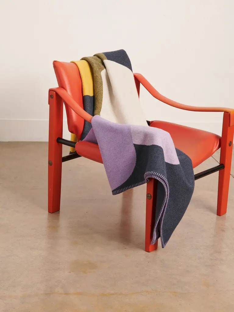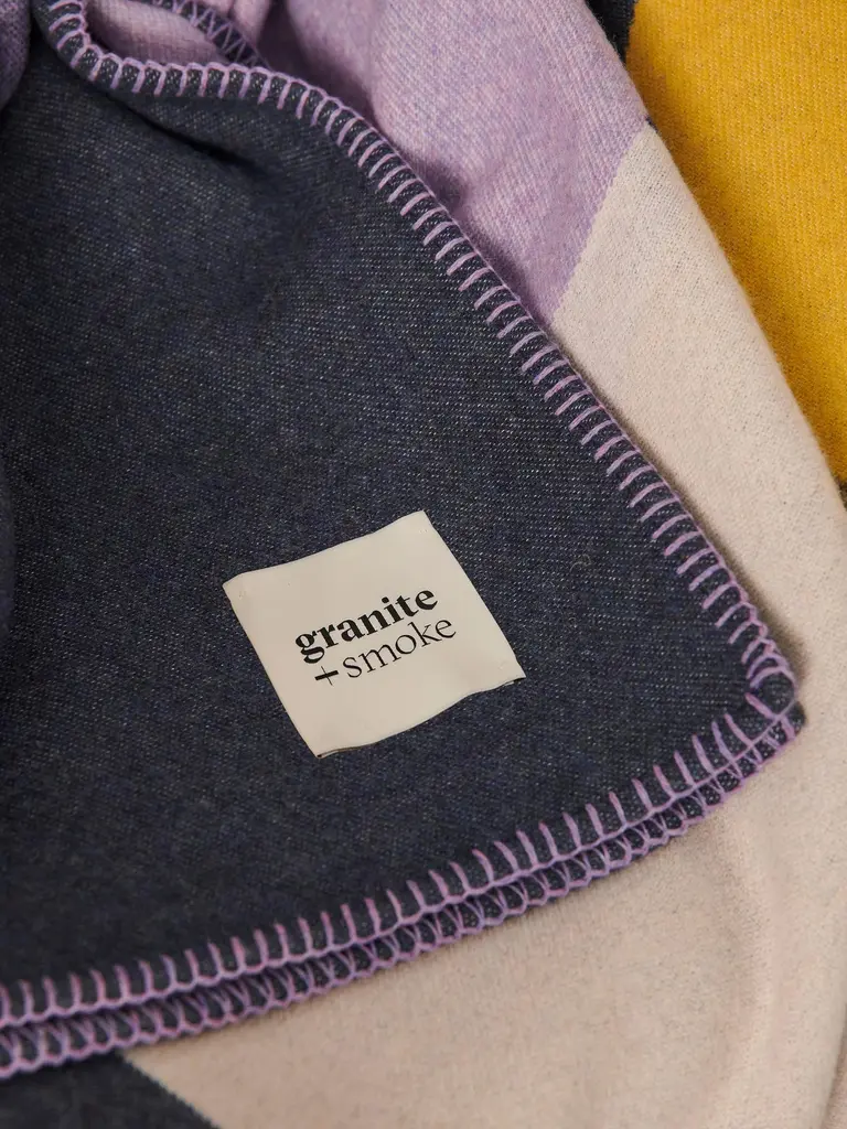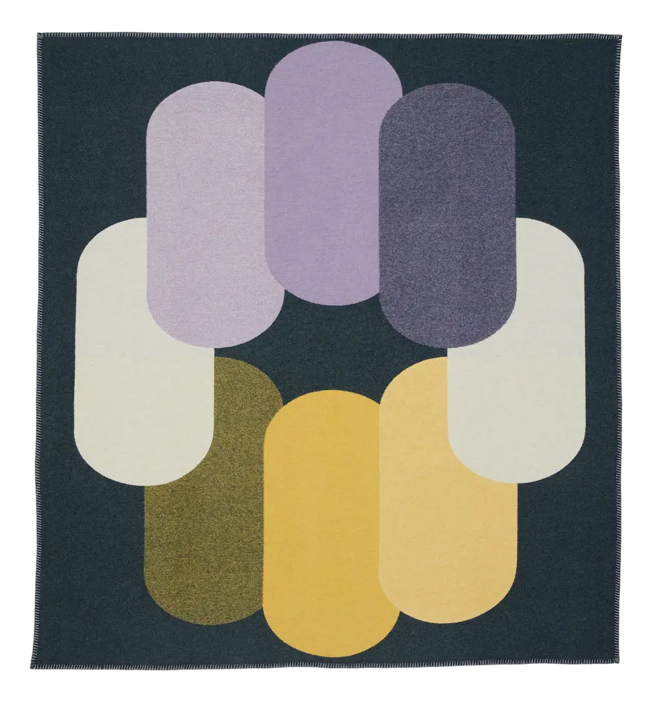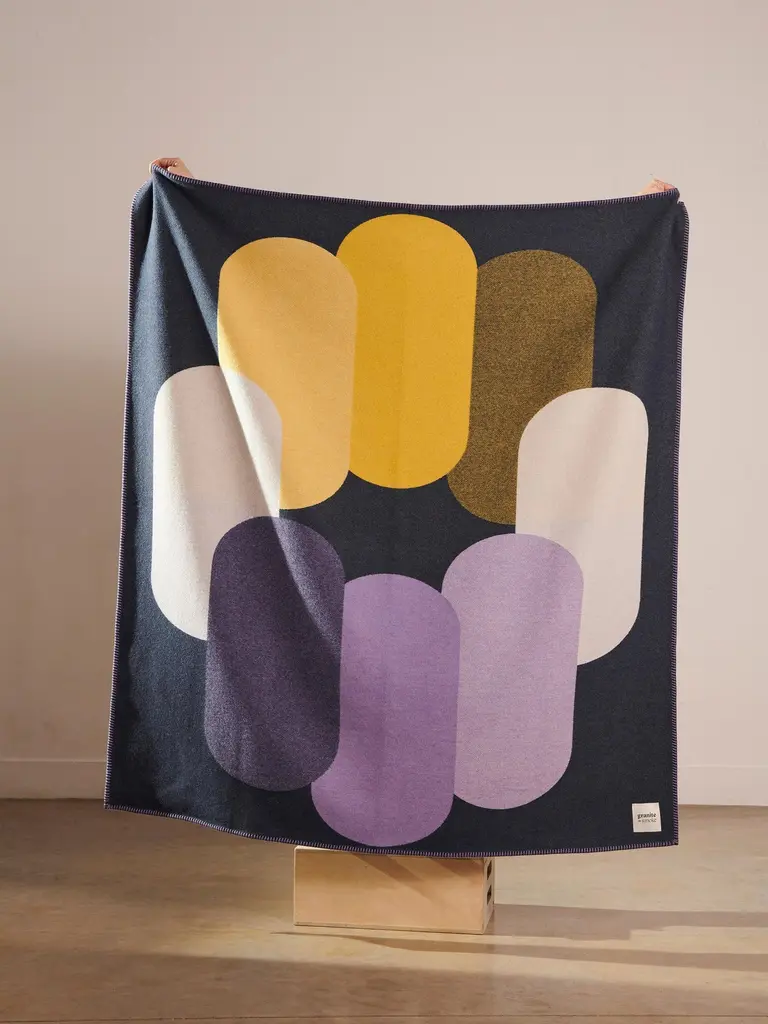 'Pill' double sided blanket woven from recycled wool in teal, purple, yellow + white by Granite + Smoke.Our recycled wool blankets are woven at a historic, 150 year old mill in the North of England. Woven on Jacquard looms they are double sided, a mid weight throw made from 100% recycled post-consumer textile waste; 70% recycled wool + 30% recycled other yarns. The bold, graphic patterns are inspired by London's graphic architectural landscape and modernist colours.Woven in England using the finest sustainably sourced recycled wool yarn from Italy. We work with specialist weavers in England who combine traditional weaving & finishing with cutting edge production and are experts in historical weaving and hand finishing. Material recycled wool.Made in England in limited runs.