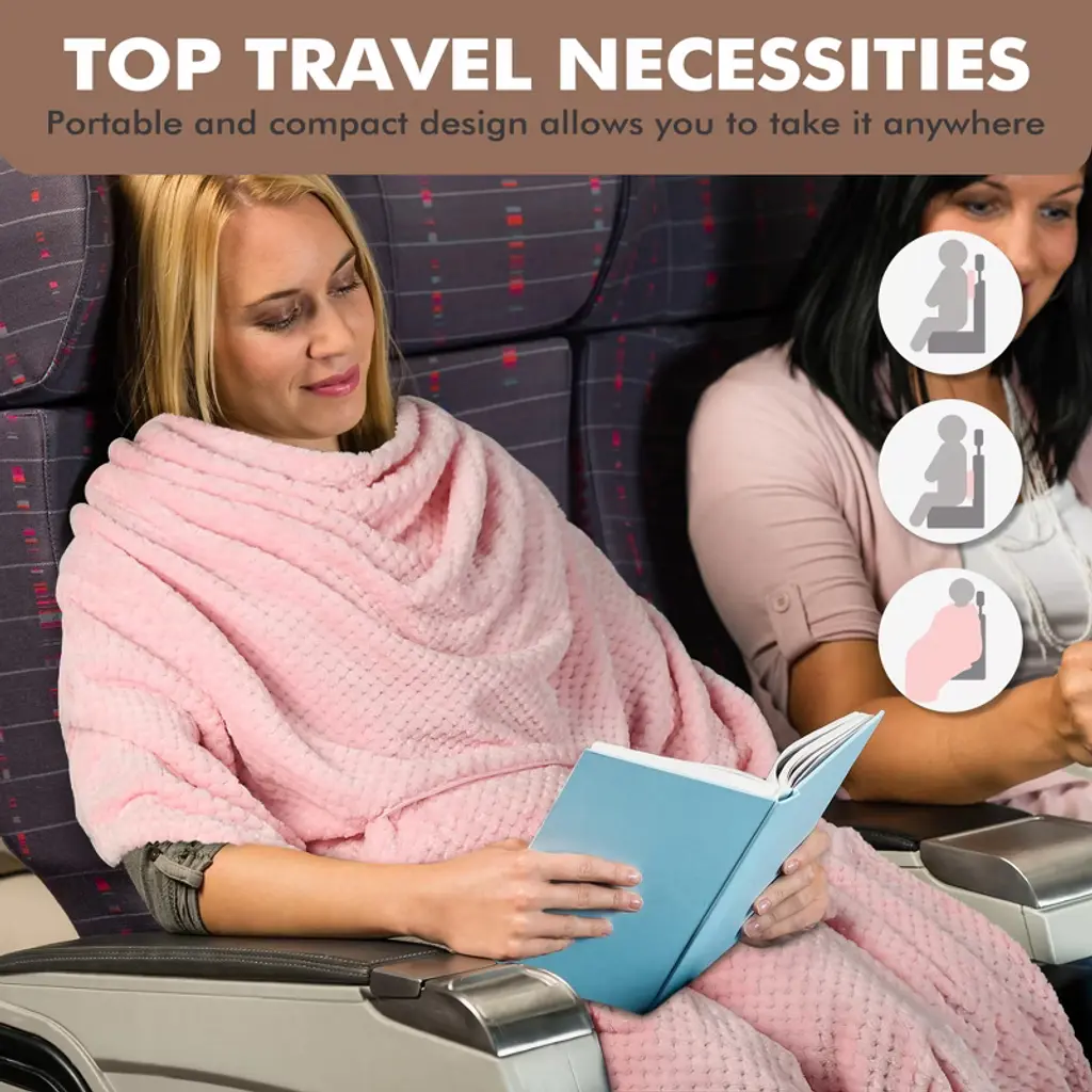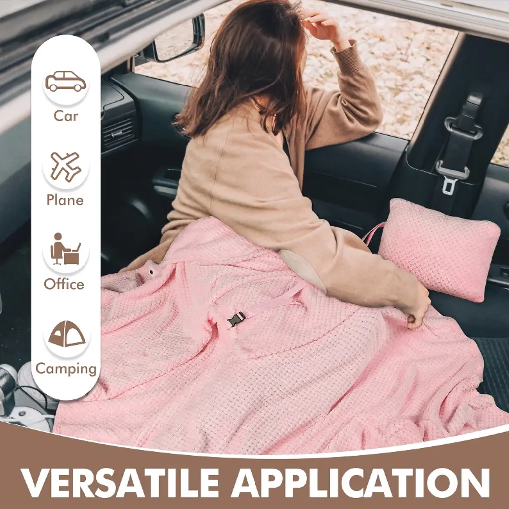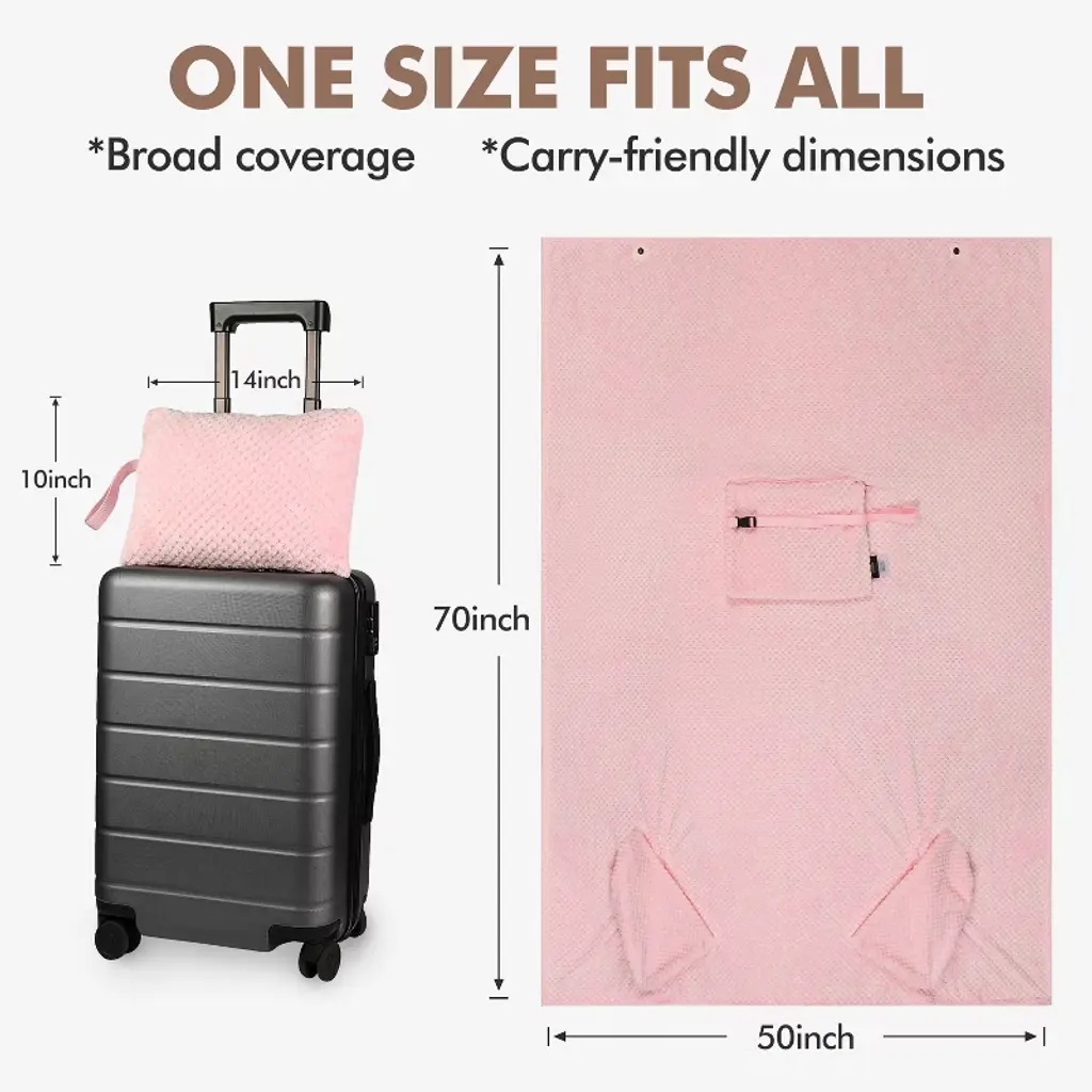 Tirrinia soft micro mink fleece 4-in-1 blanket is just the right size to wrap you in comfort while you travel. 4-in-1 blanket/pillow/lumbar support/carry case keeps you cozy, warm with polyester construction and micro mink fleece lining It easily folds within itself to a 12" x 13" carry case when folded. Turn stuff sack to front pocket with zipper for small items. The Blanket Tote unfolds easily and refolds into a convenient pillow, lumbar support, and carry case with handle. Spread it out as much as 40 inch wide, 60 inch long blanket to protect you from the shoulder, wear it around you during your travels! Blanket, pillow, lumbar support, carry case... It's a highly functional unique design with a self-contained case and convenient handle for easy toting, a must-have for outdoors event! Care Instructions: wash in cold water and tumble dry at low temperature. Perfect for beach, camping, picnics, transportation, concerts, movie, emergencies & outdoors. Package Includes: 1x 4-in-1 Travel Blanket