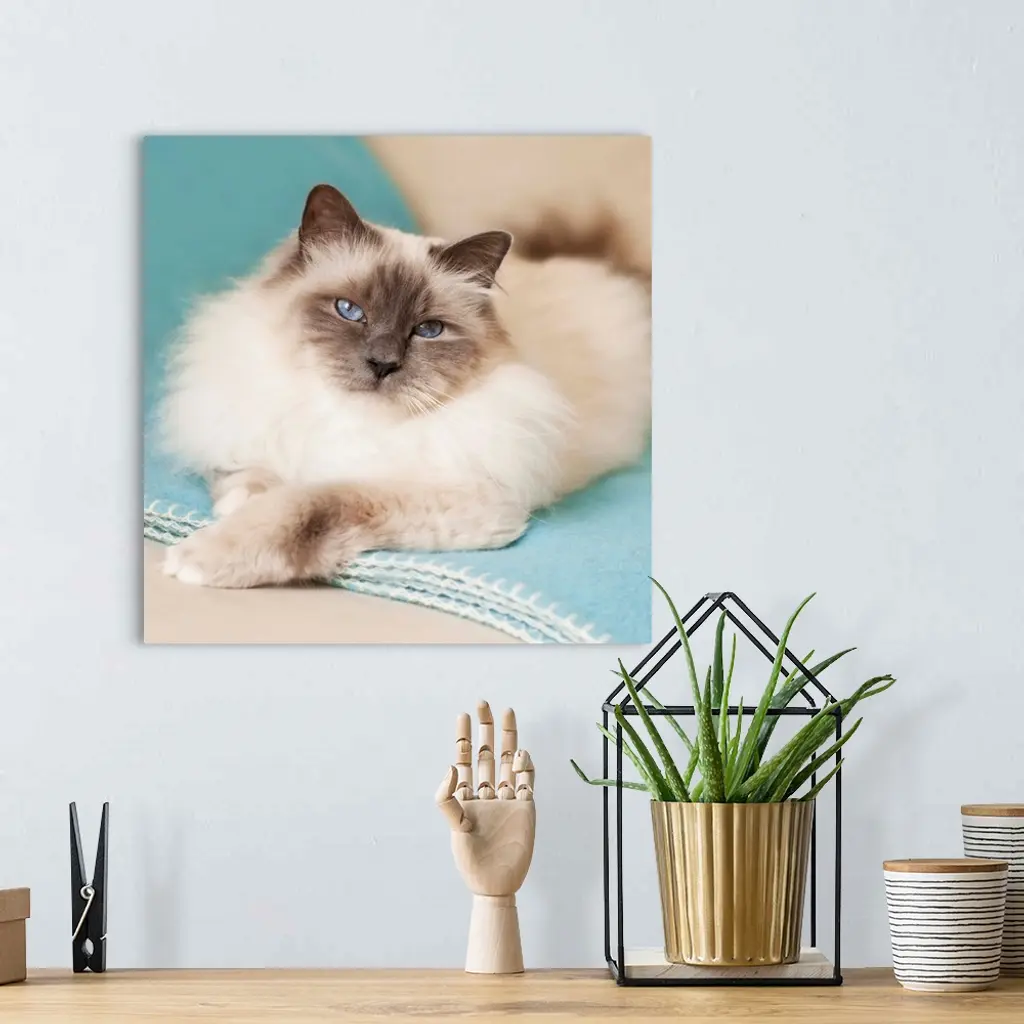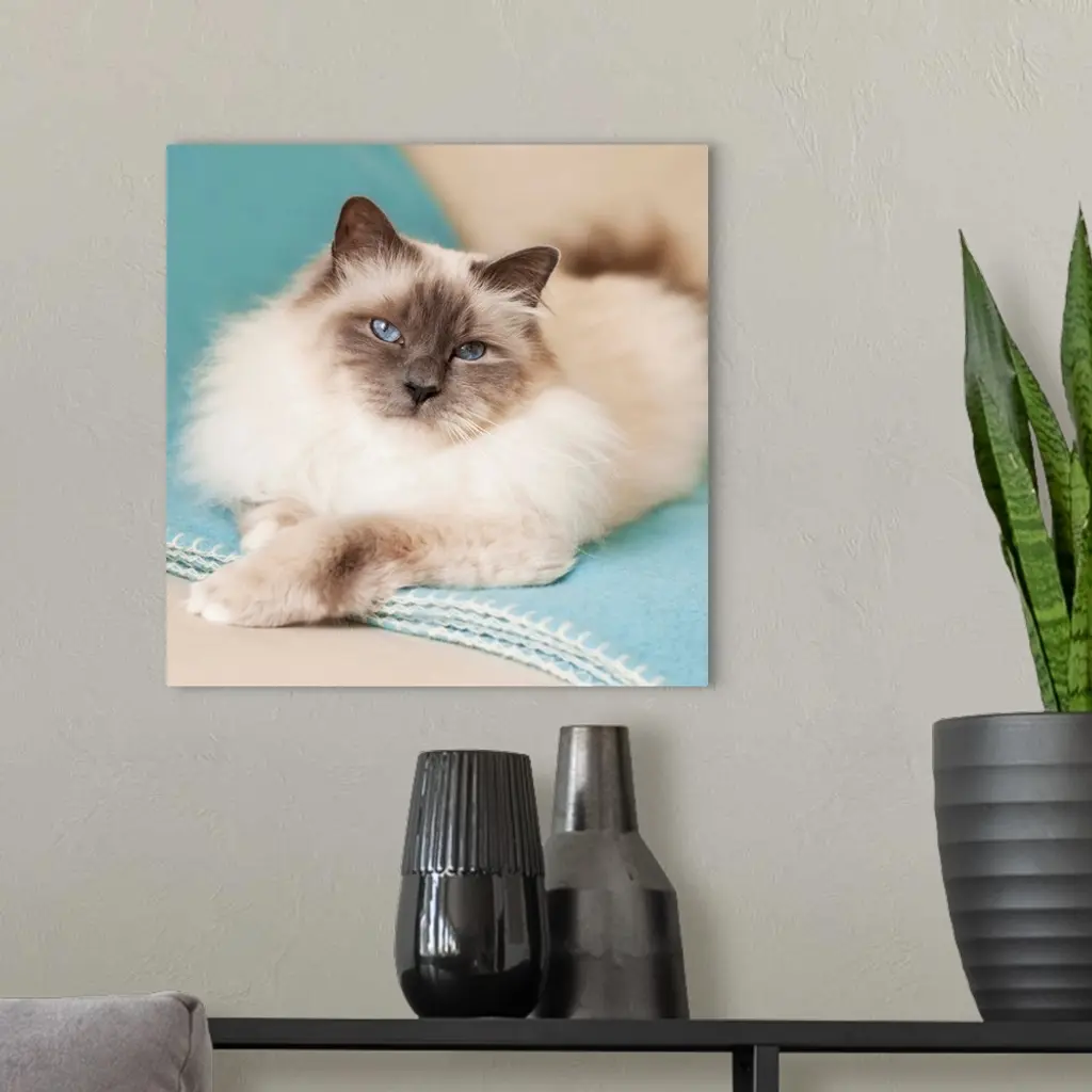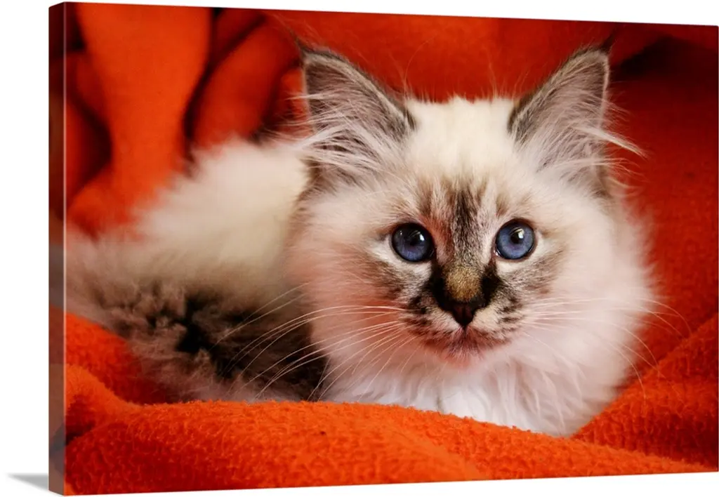 White sacred birman cat with blue eyes lying on blue blanket. wall art for home and office decor. Discover canvas art prints, photos, mural, big canvas art and framed wall art in GreatBigCanvas.com's varied collections.