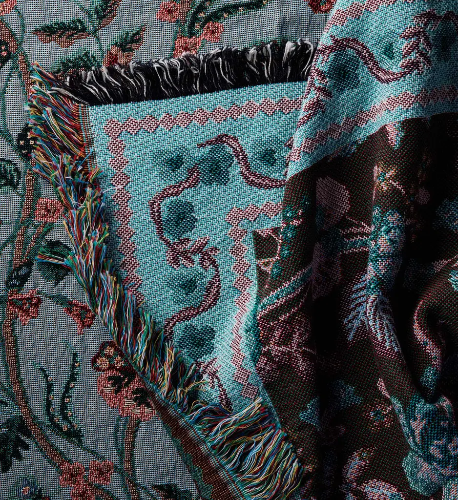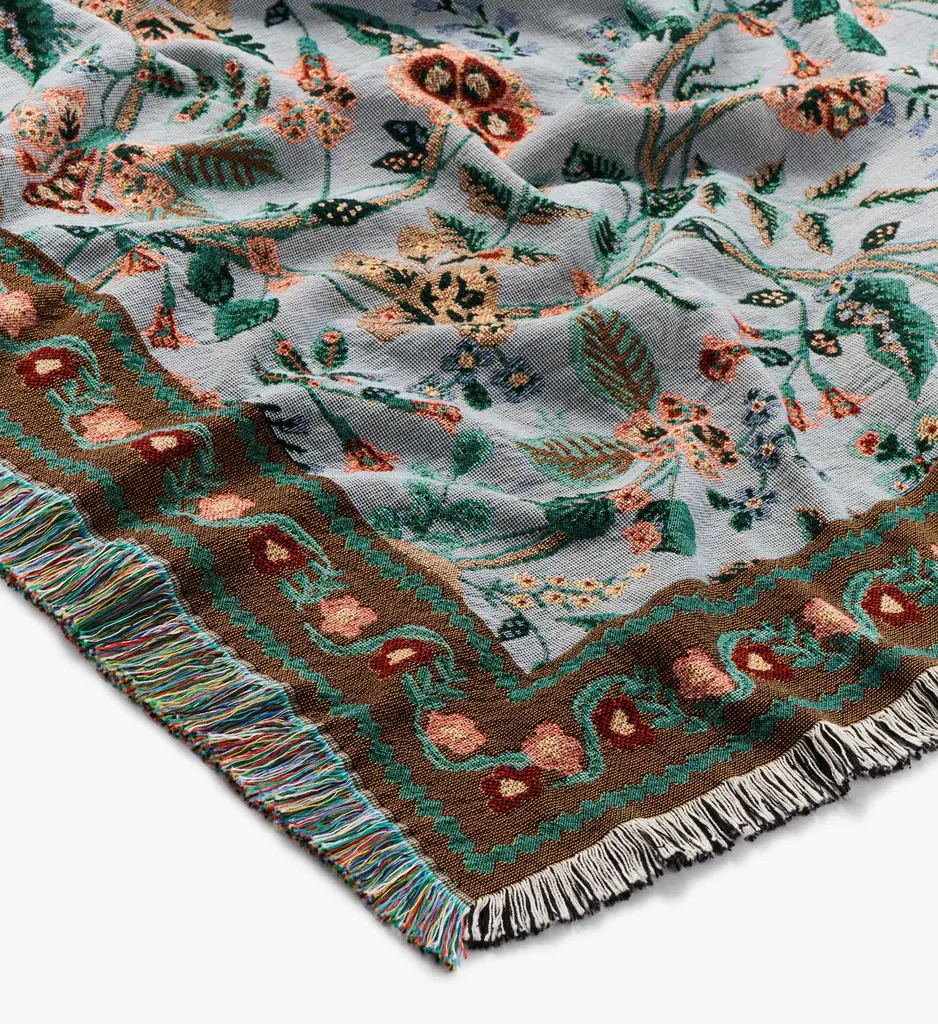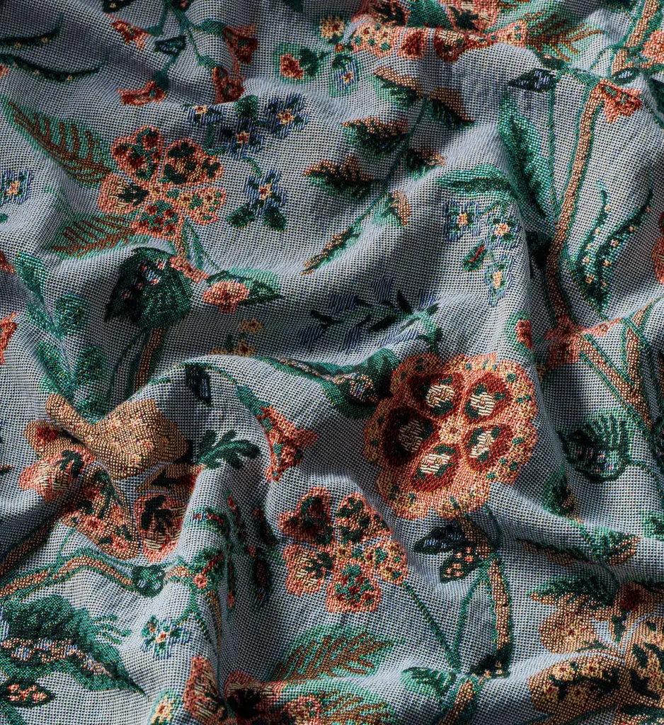 A timeless yet versatile throw, this cozy cotton blanket features elegant Gracie florals against a cool, slate blue background. Each blanket is woven-to-order in North Carolina.