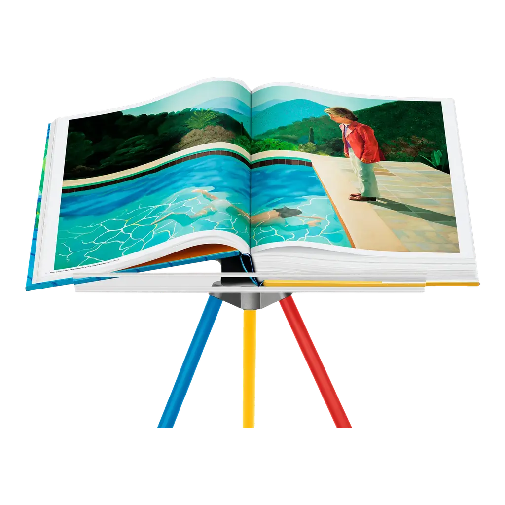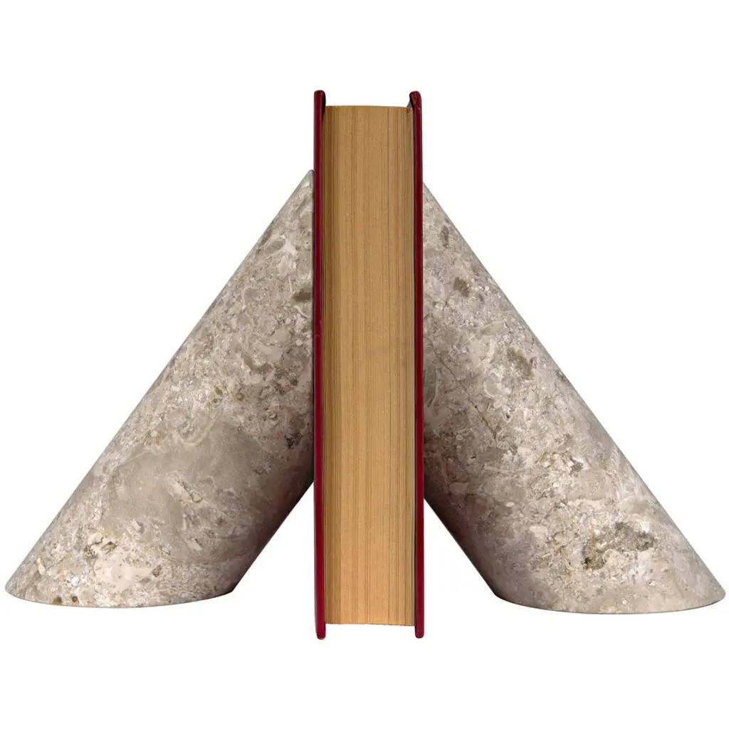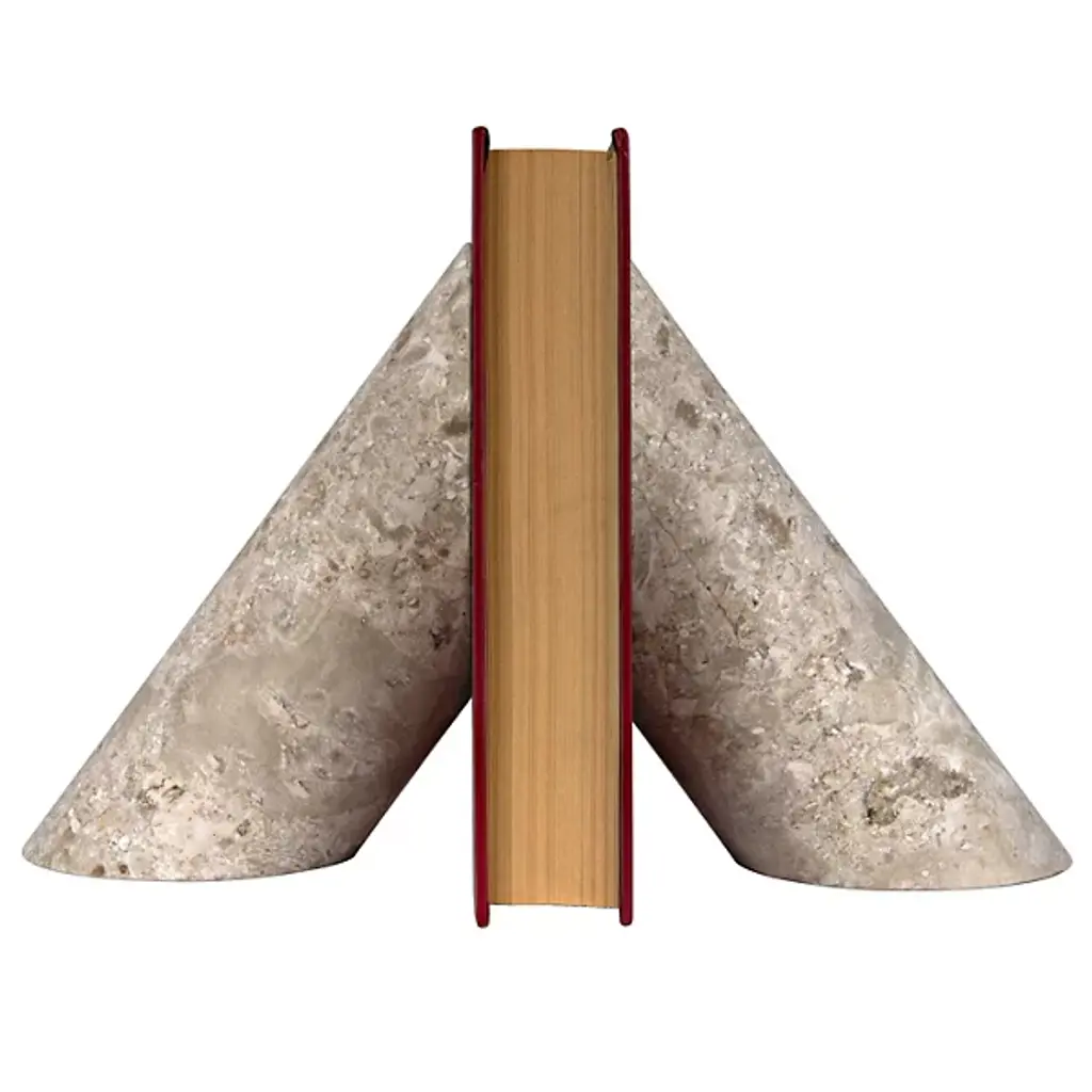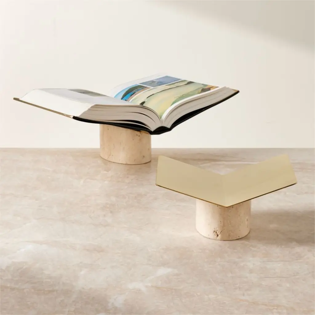 Featuring a honed white travertine base, polished brass book stand props up books with ease. Use the stand to display beautiful photography from a book on art or architecture. Brass is unlacquered, offering a living finish that will develop the patina of a vintage find. Pair with a coffee table book for a thoughtful gift. CB2 exclusive.Due to the nature of the material, brass patina will vary in color and darken over time.
