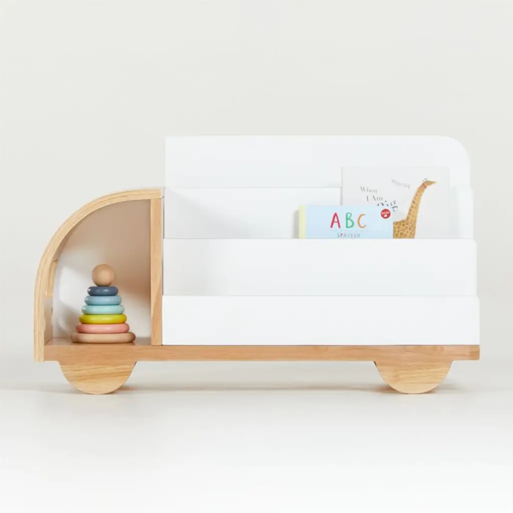 We suggest you park our Truck Bookcase in the nearest kids room or nursery. Sure to be adored by your little road trip enthusiast, it features multi-tiered shelving that makes it easy to organize books, papers and folders. The open storage compartment up front is a great spot for favorite toys, and the low-to-the-ground design allows toddlers to access it all by themselves. The truck's cab has adorable cutout details that resemble a windshield and headlight. And the balance of warm natural wood grain and a clean white finish lends this sweet, simple kids bookcase a touch of contrasting appeal.