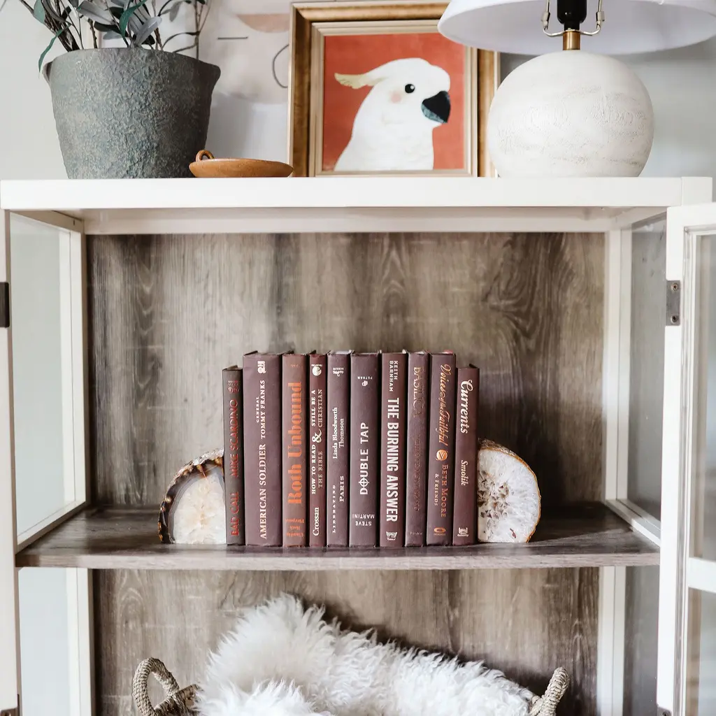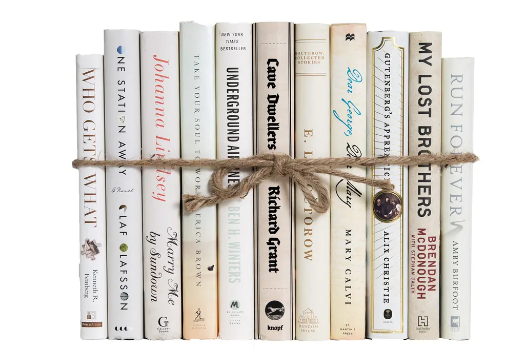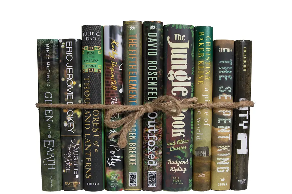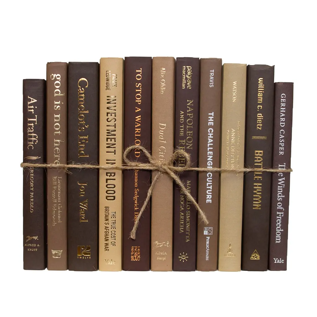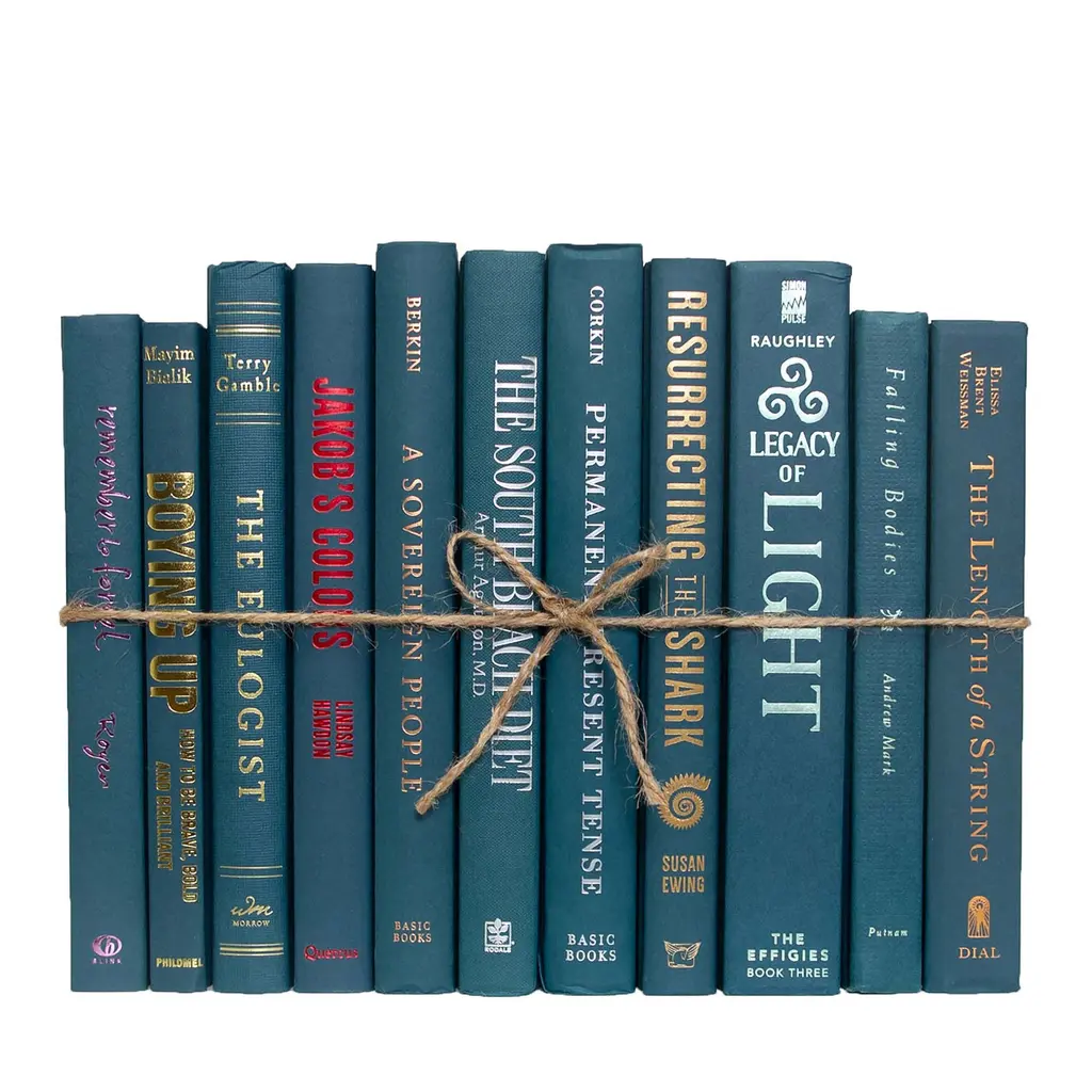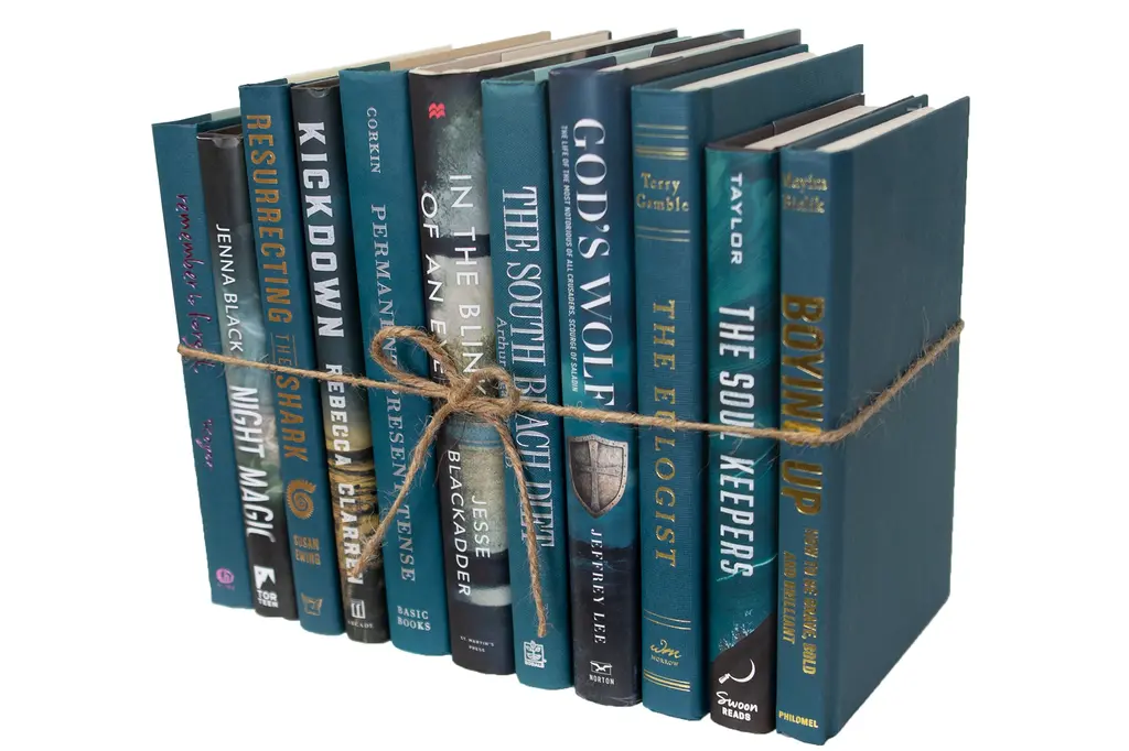 The Cloth Colorpak Collection includes a variety of modern hardcover books wrapped in jute twine to make presenting simple. The books are all slightly worn down for a more authentic look and were published between 1980 and now.