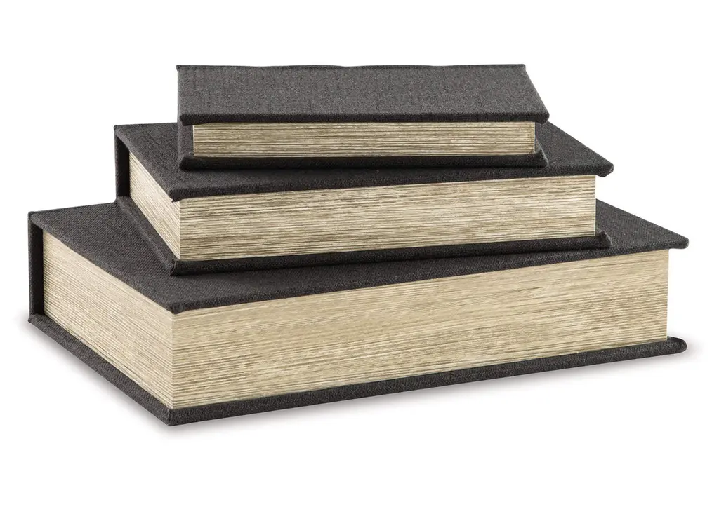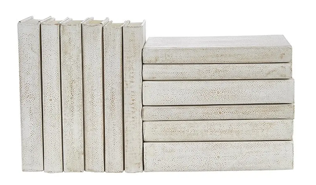This set of 15 decorative books are finished in a matte gold . They feature raised bands on the spines and have white covers.