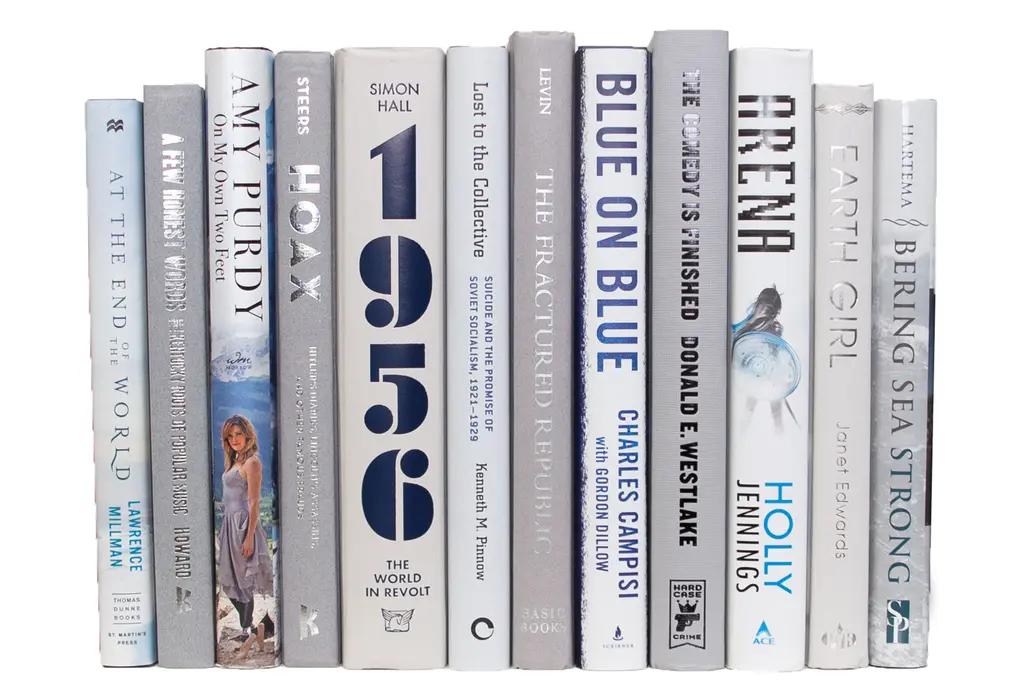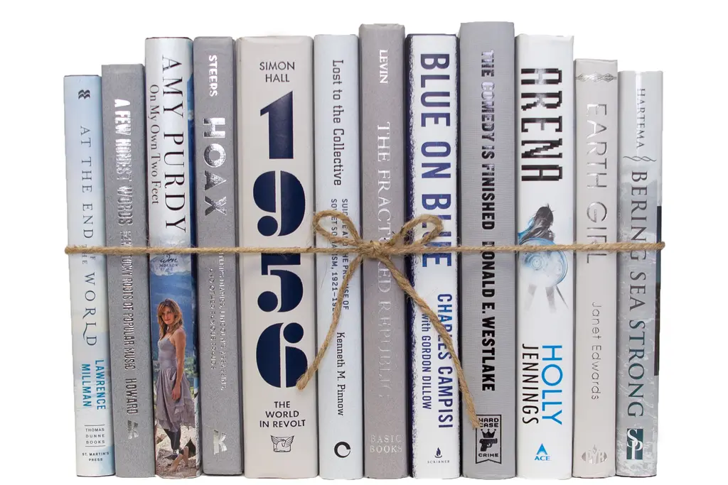 One linear foot of authentic modern cloth and dust jacketed books in varied shades of white and silver grey with blue accents. All books are published 1980-present and include a variety of literary works, period novels and topical texts with light overall wear. Contains 10-12 books with an average height of 8.5-9.5" and hand-wrapped in jute twine. Titles will differ from those pictured. If ordering multiple quantities titles may be duplicated.