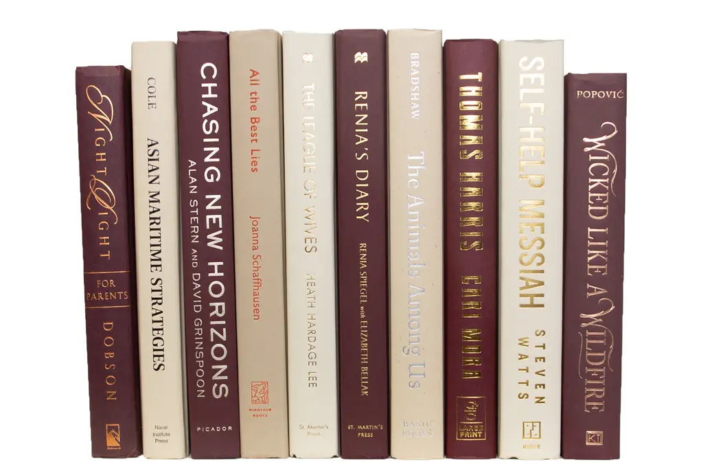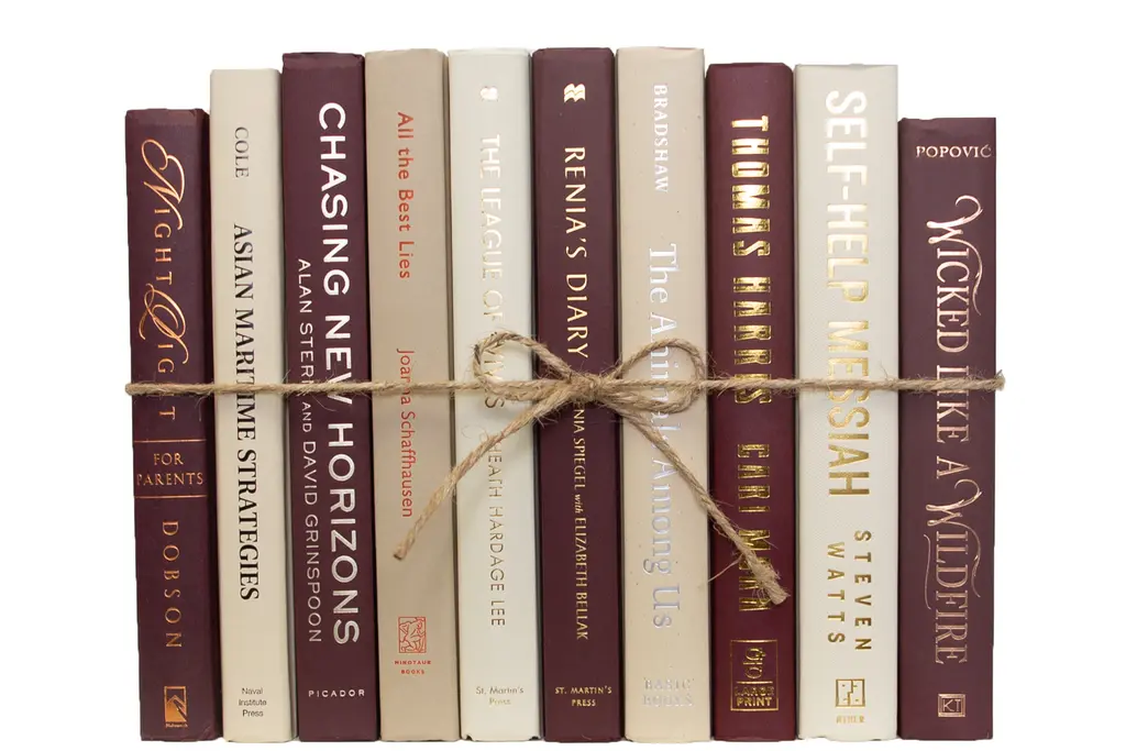 Take your design to a new level with the Modern Cabernet ColorPak from Booth & Williams. One linear foot of authentic modern hardback books in varied shades of deep burgundy, tan, and cream. All books are published 1980-present and include a variety of literary works, period novels and topical texts with light overall wear. Contains 10-12 books with an average height of 8.5-9.5" and hand-wrapped in jute twine. Order as many ColorPaks as you need to complete your project. Titles will differ from