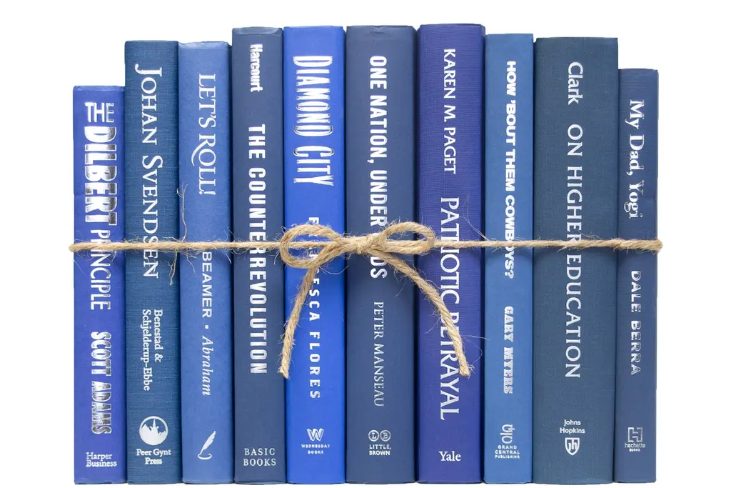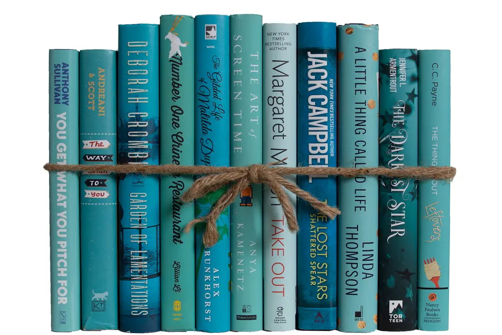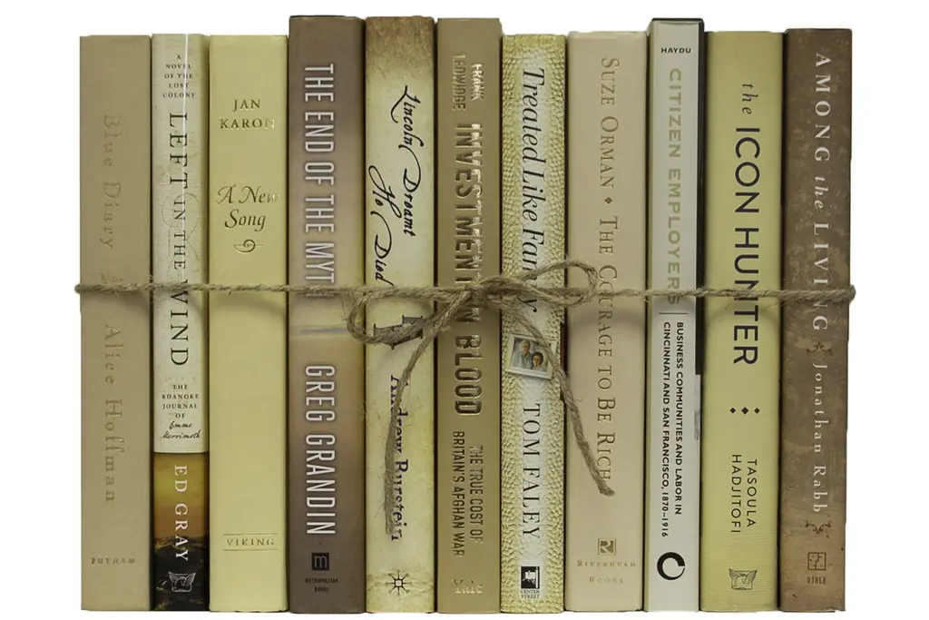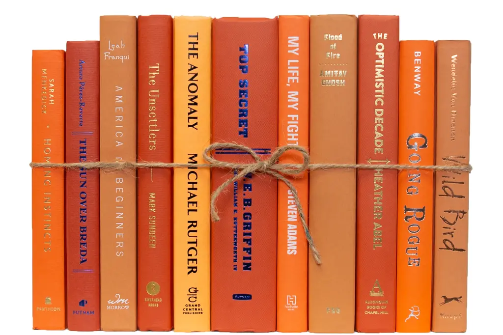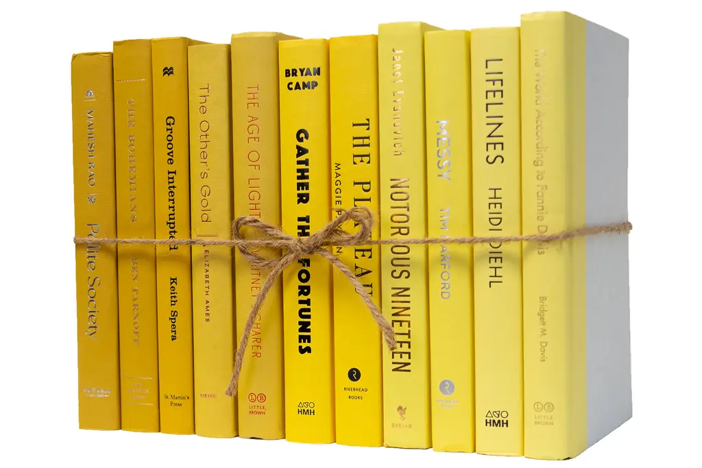 One linear foot of authentic modern hardback books in crisp and blended ombré shades that range from dark to light yellow. All books are published 1980-present and include a variety of literary works, period novels and topical texts with light overall wear. Contains 10-12 books with an average height of 8.5-9.5" and hand-wrapped in jute twine. Order as many ColorPaks as you need to complete your project. Titles will differ from those pictured.
