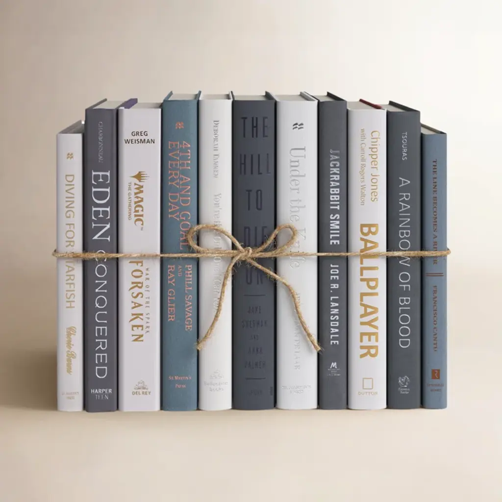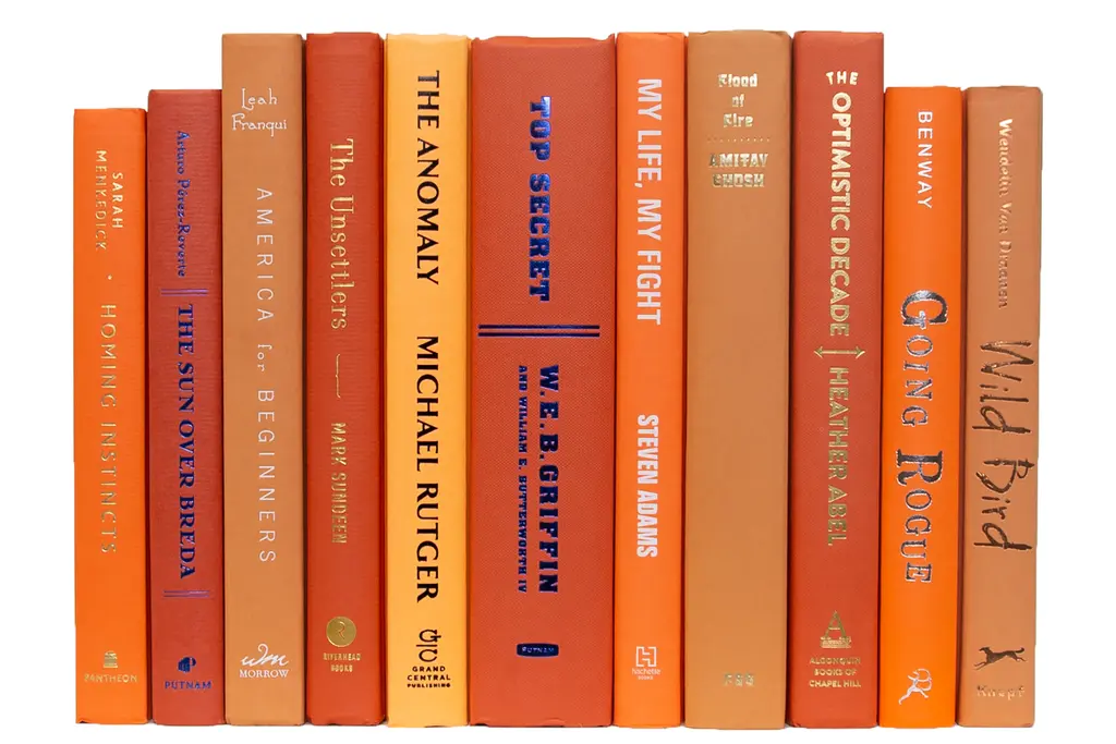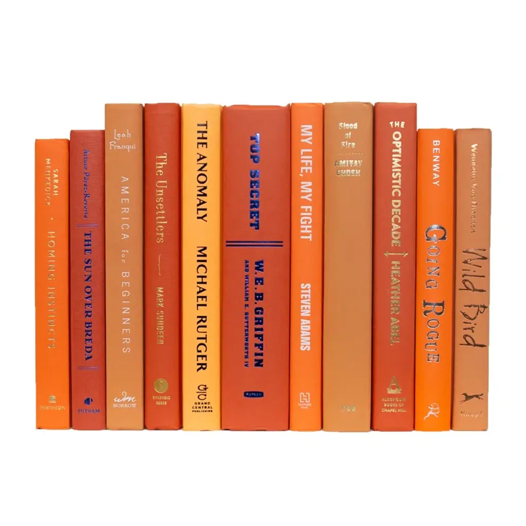 One linear foot of authentic modern hardback books in crisp and blended shades of orange. All books are published 1980-present and include a variety of literary works, period novels and topical texts with light overall wear. Contains 10-12 books with an average height of 8.5-9.5" and hand-wrapped in jute twine. Order as many ColorPaks as you need to complete your project. Titles will differ from those pictured. If ordering multiple quantities titles may be duplicated.