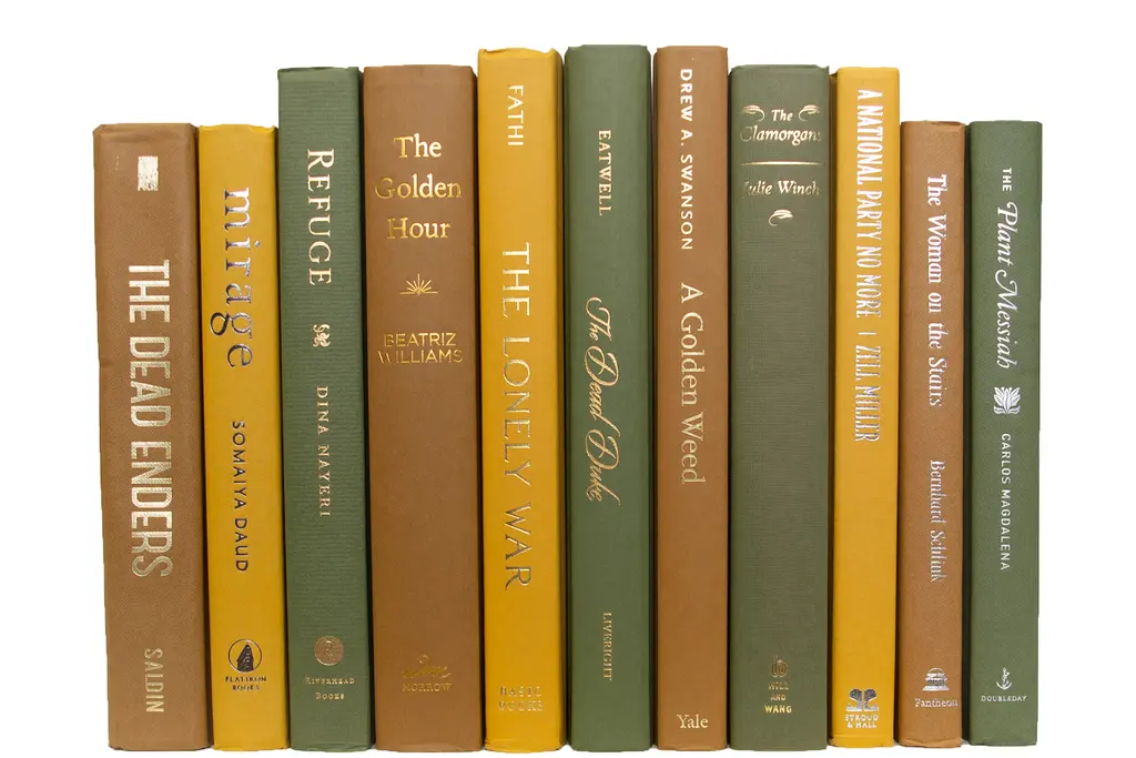 One linear foot of authentic modern hardback books in varied shades of medium brown, saffron yellow, and fir green. All books are published 1980-present and include a variety of literary works, period novels and topical texts with light overall wear. Contains 10-12 books with an average height of 8.5-9.5" and hand-wrapped in jute twine. Order as many ColorPaks as you need to complete your project. Titles will differ from those pictured. If ordering multiple quantities titles may be duplicated.