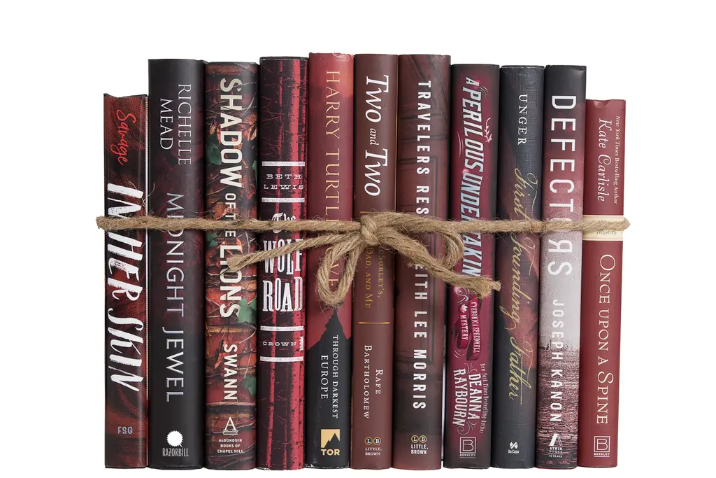Transform your space with our Modern Onyx Flame Dust Jacket ColorPak. These are authentic Modern hardback books in their original dust jackets in black with red and orange accents. All books are published 1980-present and include a variety of fiction and non-fiction titles. Contains 10-12 books with an average height of 8.5-9.5". Exact titles will differ from those pictured. If ordering multiple quantities titles may be duplicated.
