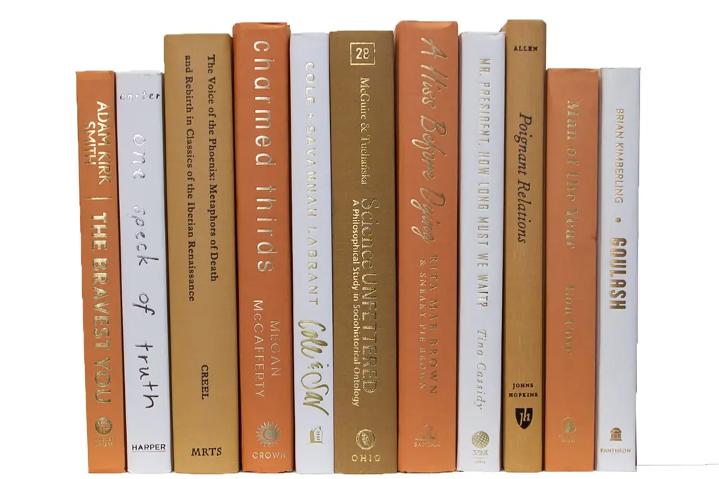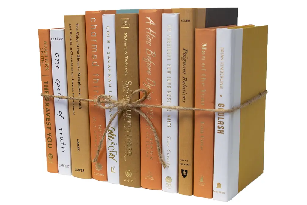 One linear foot of authentic modern hardback books in varied shades of orange peach, golden brown and white. All books are published 1980-present and include a variety of literary works, period novels and topical texts with light overall wear. Contains 10-12 books with an average height of 8.5-9.5" and hand-wrapped in jute twine. Order as many ColorPaks as you need to complete your project. Titles will differ from those pictured. If ordering multiple quantities titles may be duplicated.