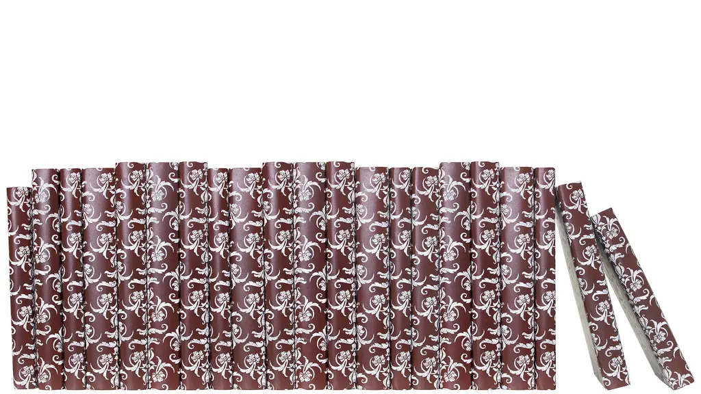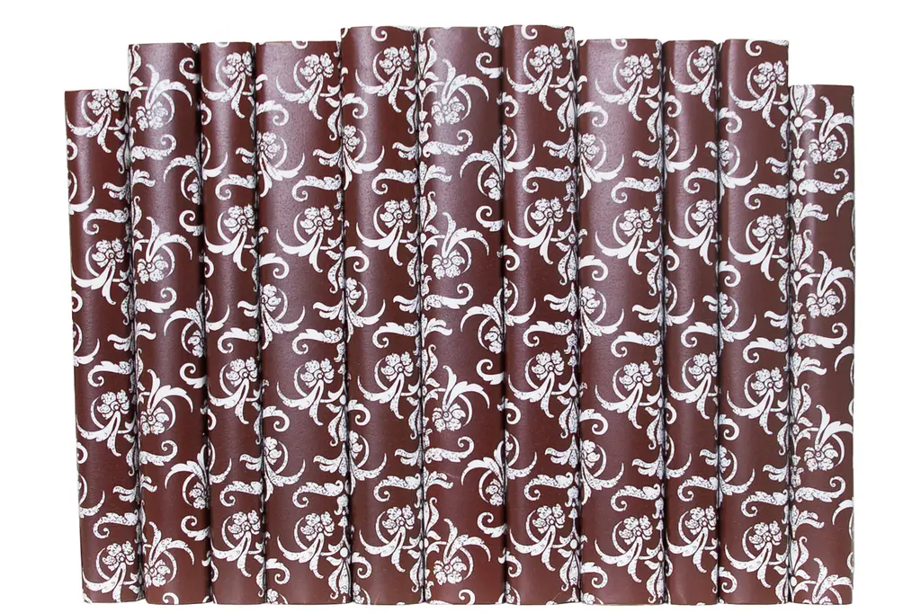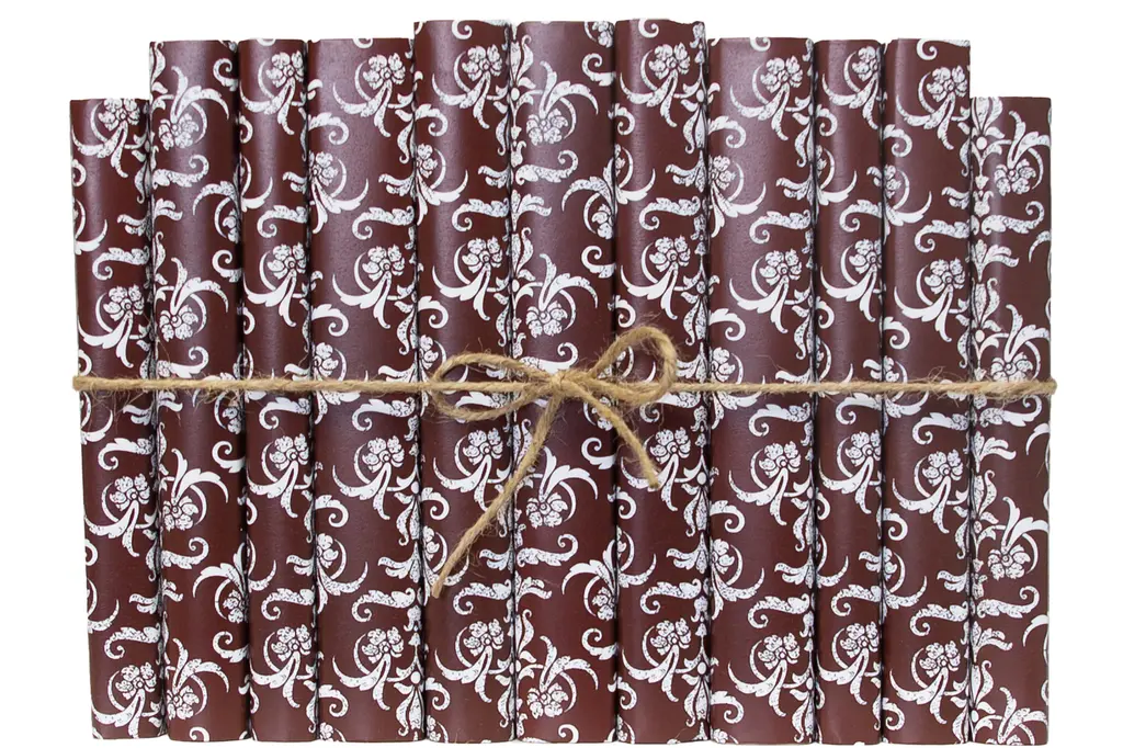 Take your design to a new level with Garnet Demask Wrapped ColorPak from Booth & Williams. Featuring one linear foot of authentic modern hardback books wrapped in a warm deep red and white accented demask patterned paper. Contains 10-12 books with an average height of 8.5-10" and hand-wrapped in jute twine. Order as many ColorPaks as you need to complete your project.