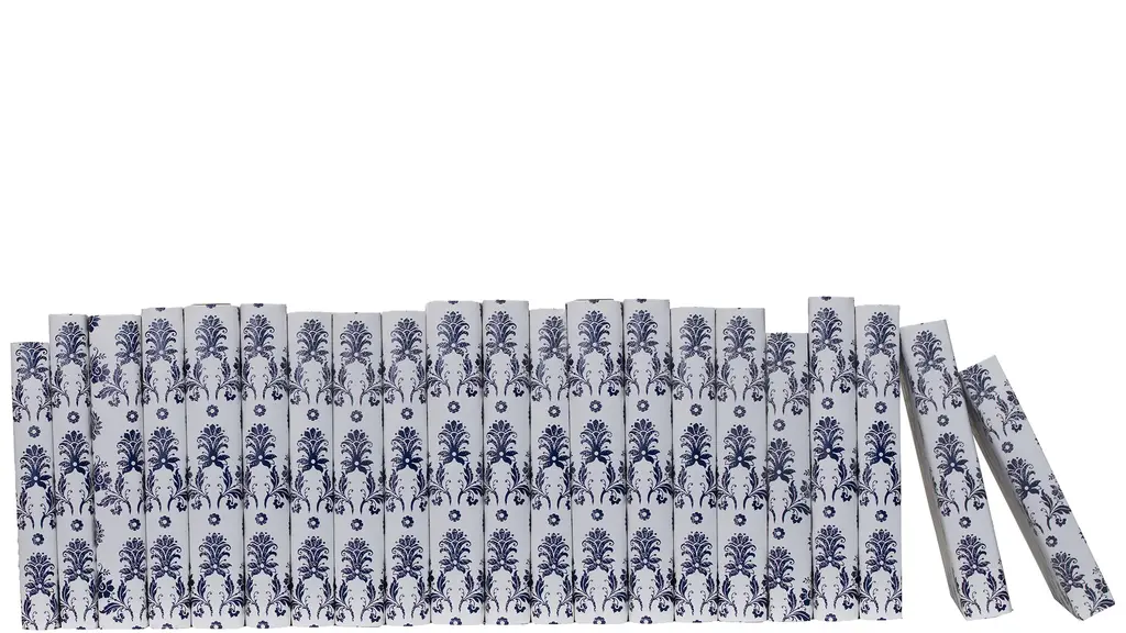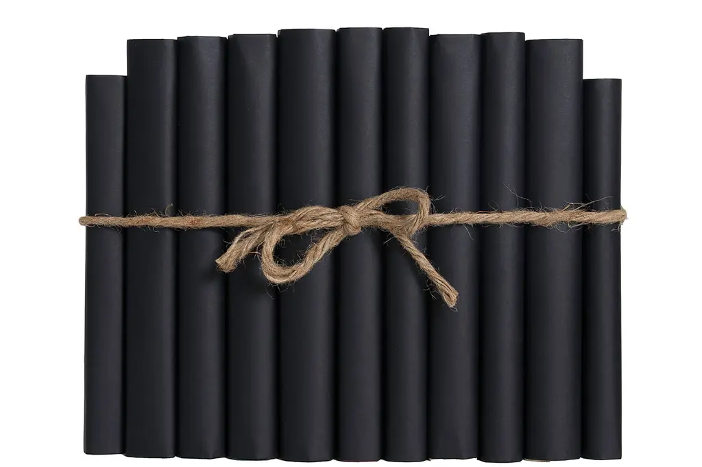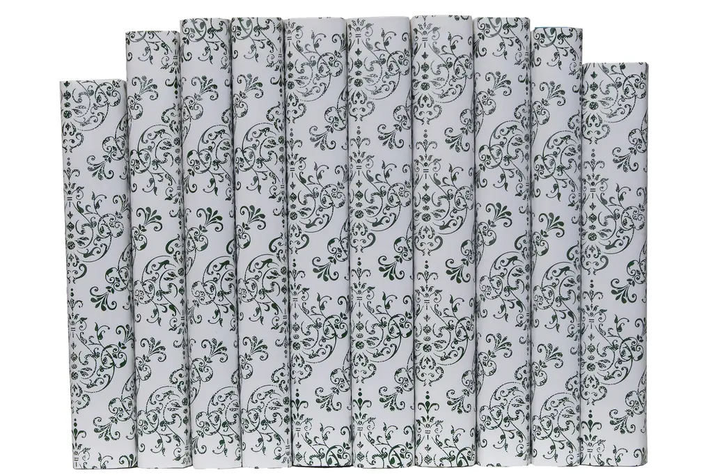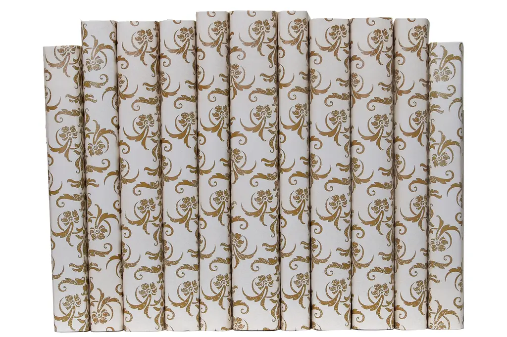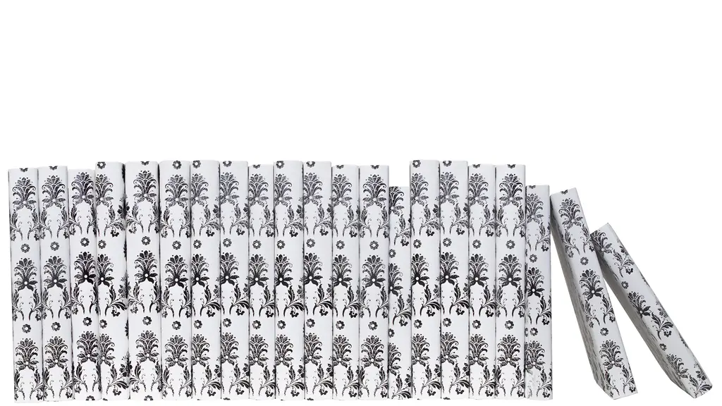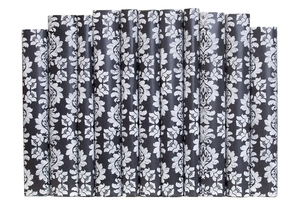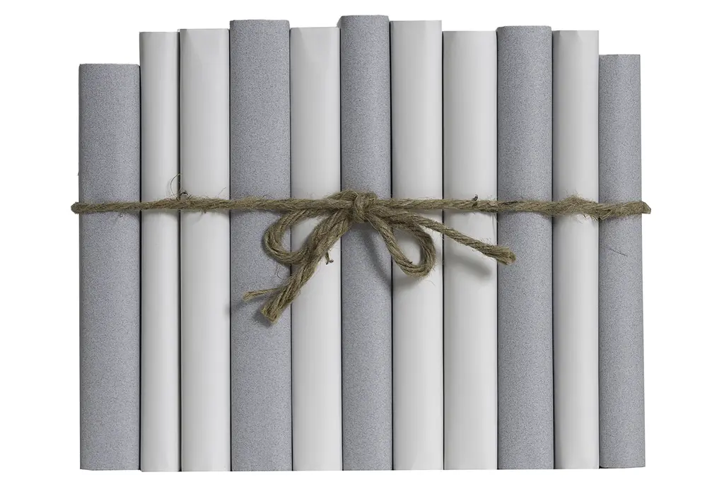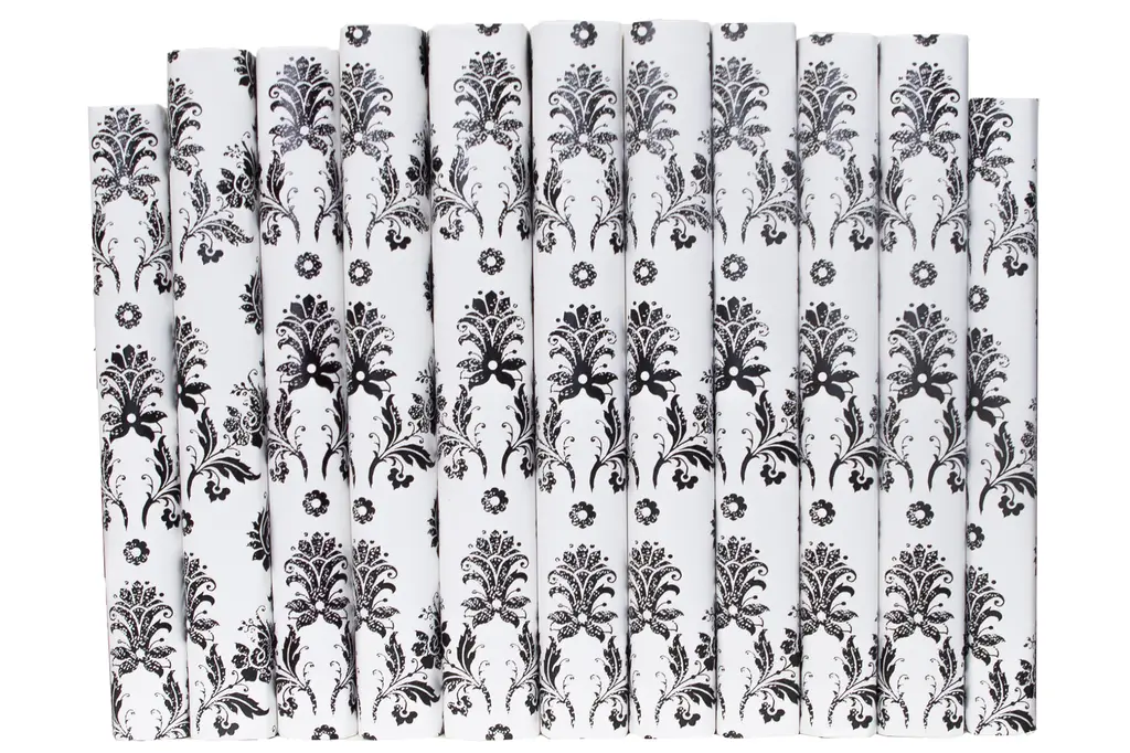 Take your design to a new level with a Demask Wrapped ColorPak from Booth & Williams. Featuring one linear foot of authentic modern hardback books wrapped in dark slate grey and white demask patterned paper. Contains 10-12 books with an average height of 8.5-9.5" and hand-wrapped in jute twine. Order as many ColorPaks as you need to complete your project.