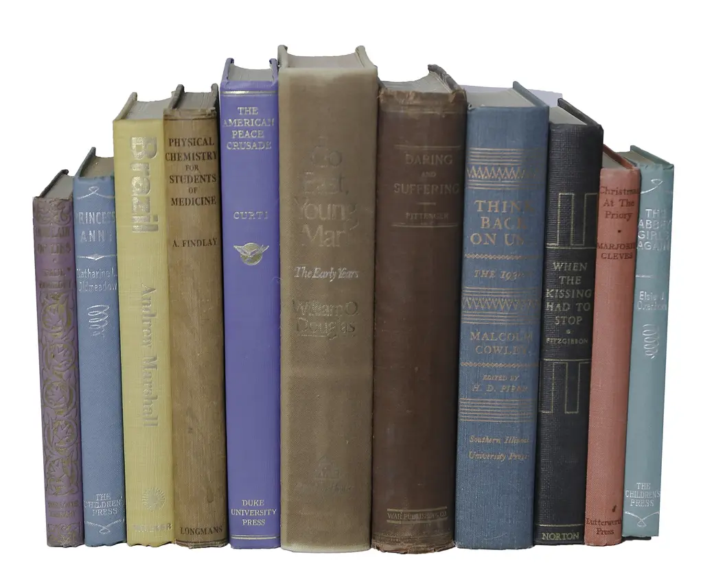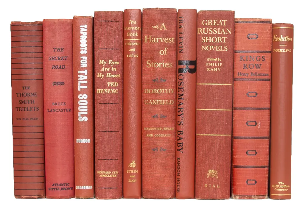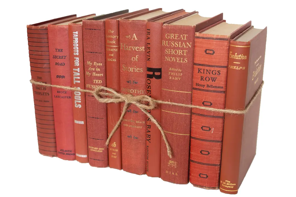 One linear foot of authentic vintage hardback books in blended shades of warm orange and brown. All books are published 1900-1969 and include a variety of literary works, period novels and topical texts with light overall wear. Contains 10-12 books with an average height of 8.5-9.5" and hand-wrapped in jute twine. Order as many ColorPaks as you need to complete your project. Titles will differ from those pictured.