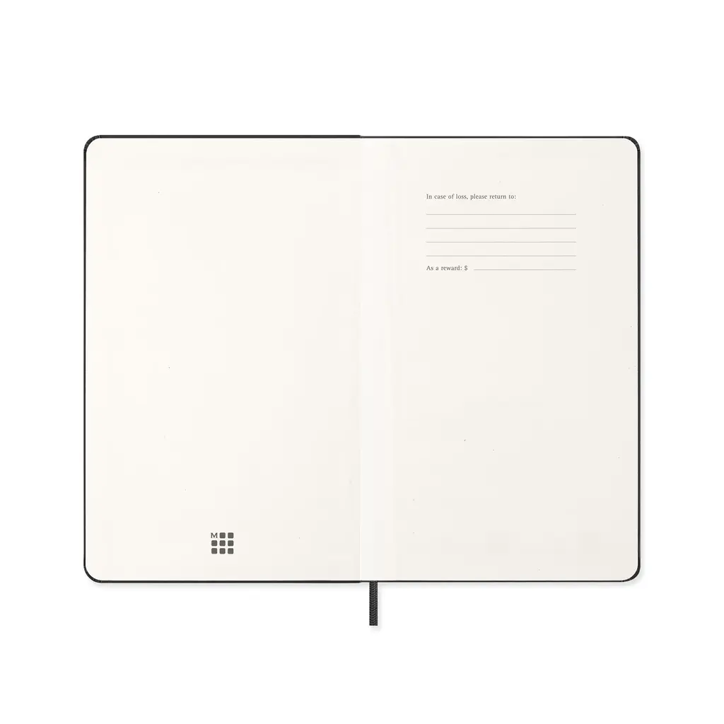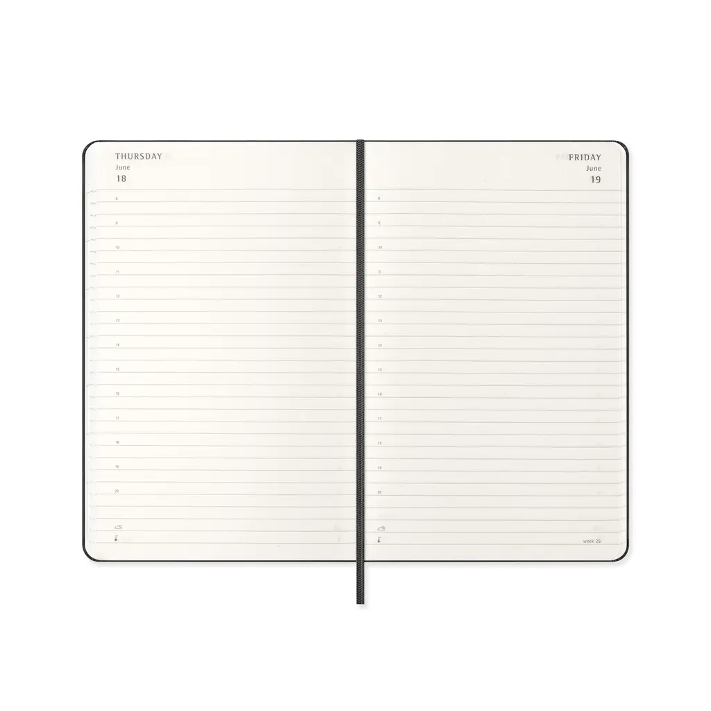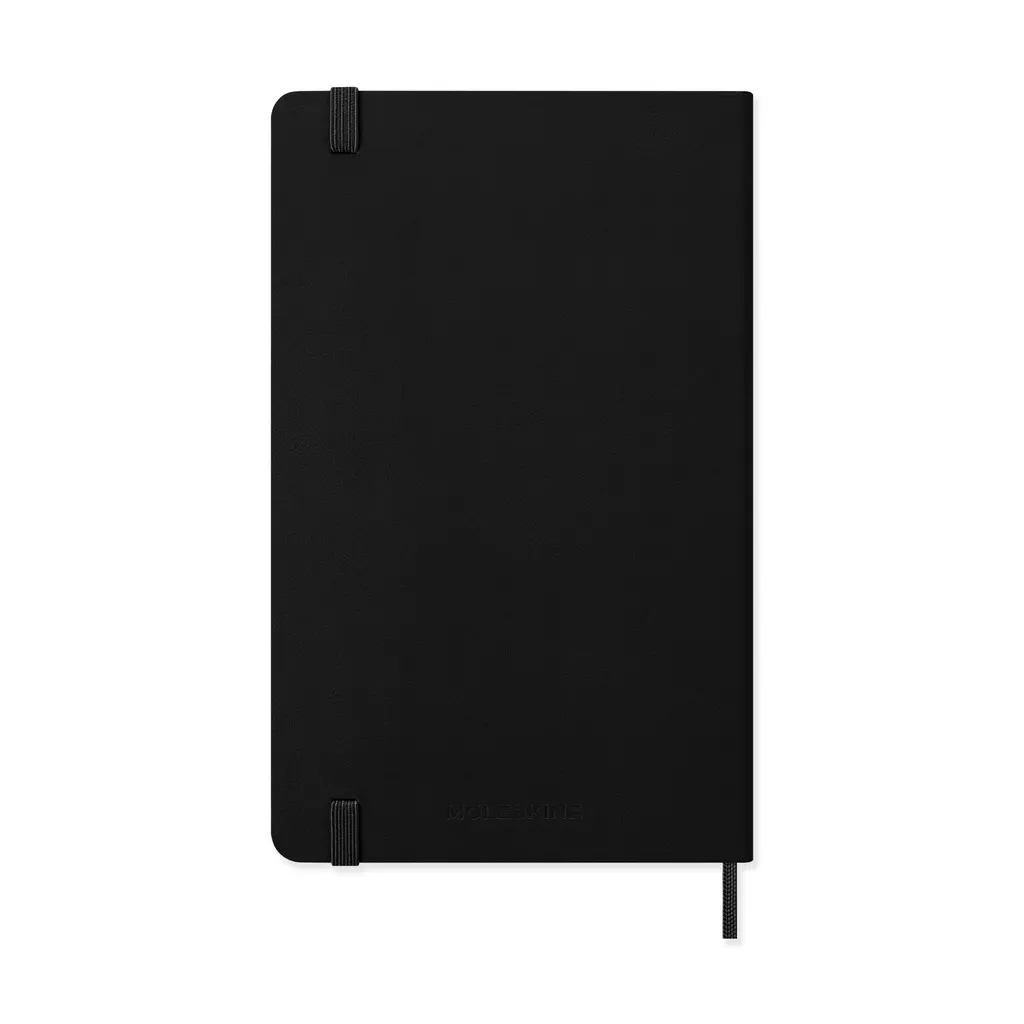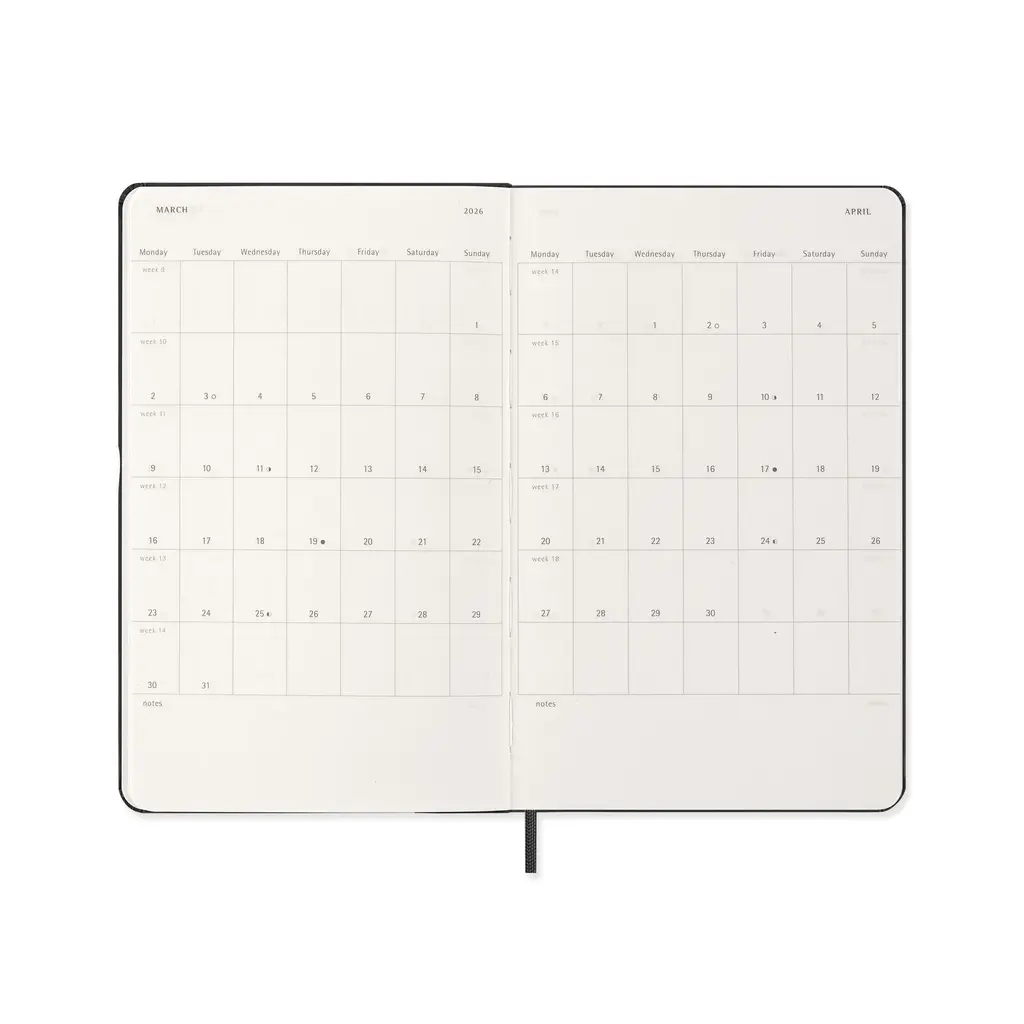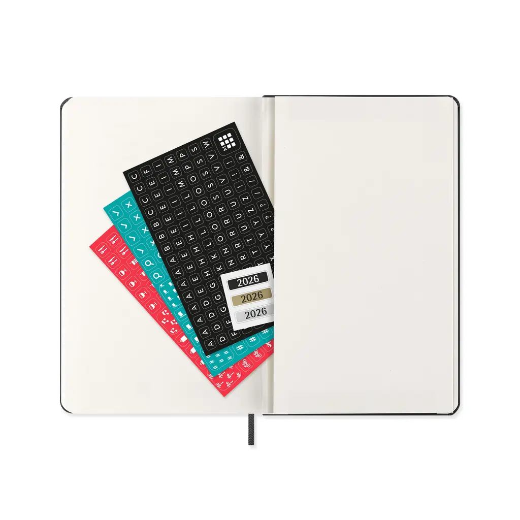 This Moleskine 2026 12-Month Large Black Hardcover Daily Diary shows each week on a two-page spread: a week on the left, and lined pages on the right for additional notes. Features a cardboard cover with rounded edges, 144 ivory-coloured 70gsm acid-free pages, a ribbon bookmark, and an elastic closure. Includes 295 colorful stickers, divided into three sheets (one sheet of alphabet stickers, twho sheets of icon stickers), an expandable inner pocket, and an 'in case of loss' notice. January 2026–December 2026.