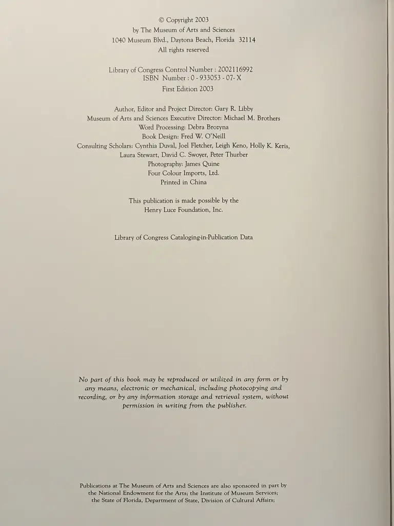 A Treasury of American Art by Gary R. Libby, selections from the Collection of the Museum of Arts and Sciences. Hardcover book with dustjacket. Stated first edition published in 2003 by the Museum of Arts and Sciences of Daytona Beach, Florida. Illustrated, 230 pages.