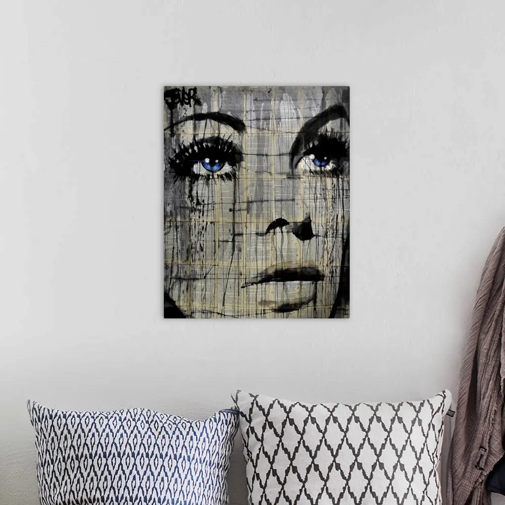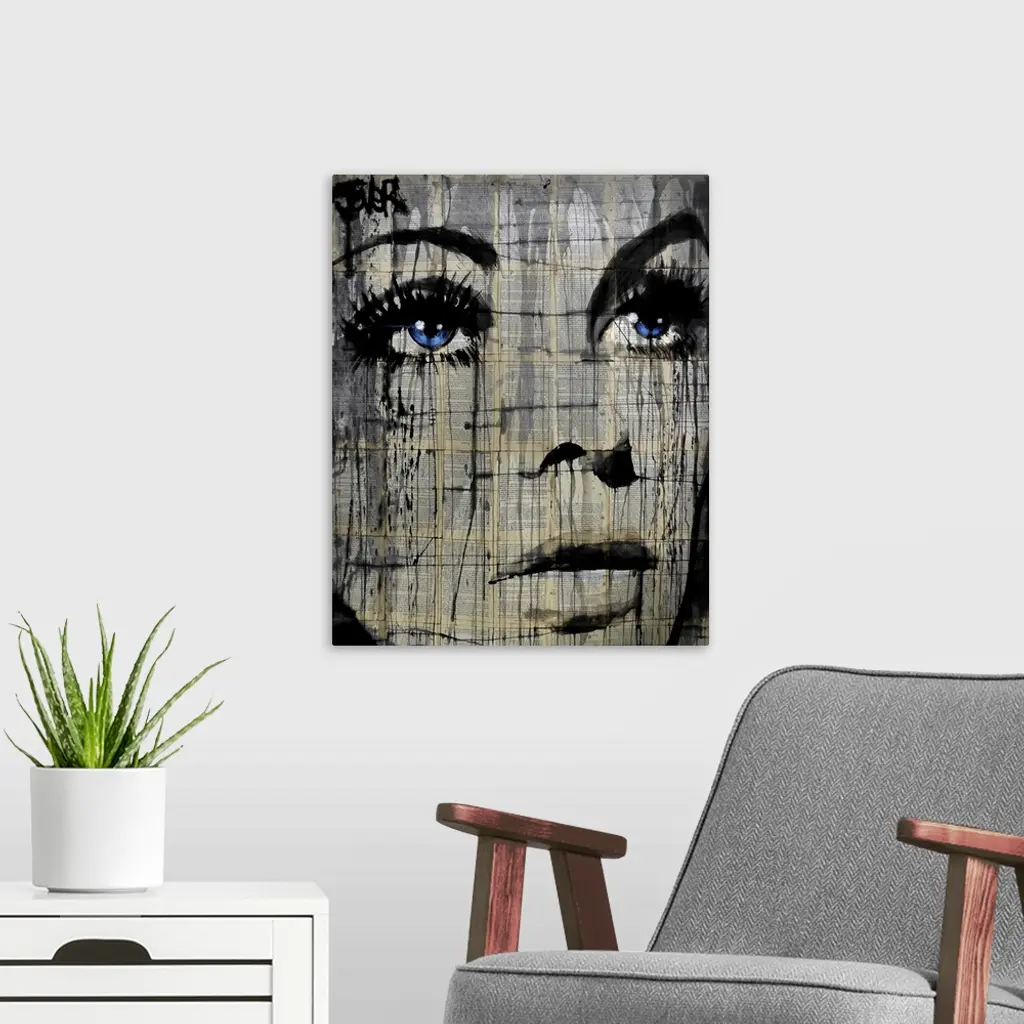 Contemporary artwork of a close-up of a woman's face with deep blue eyes against a background of tiled book pages.