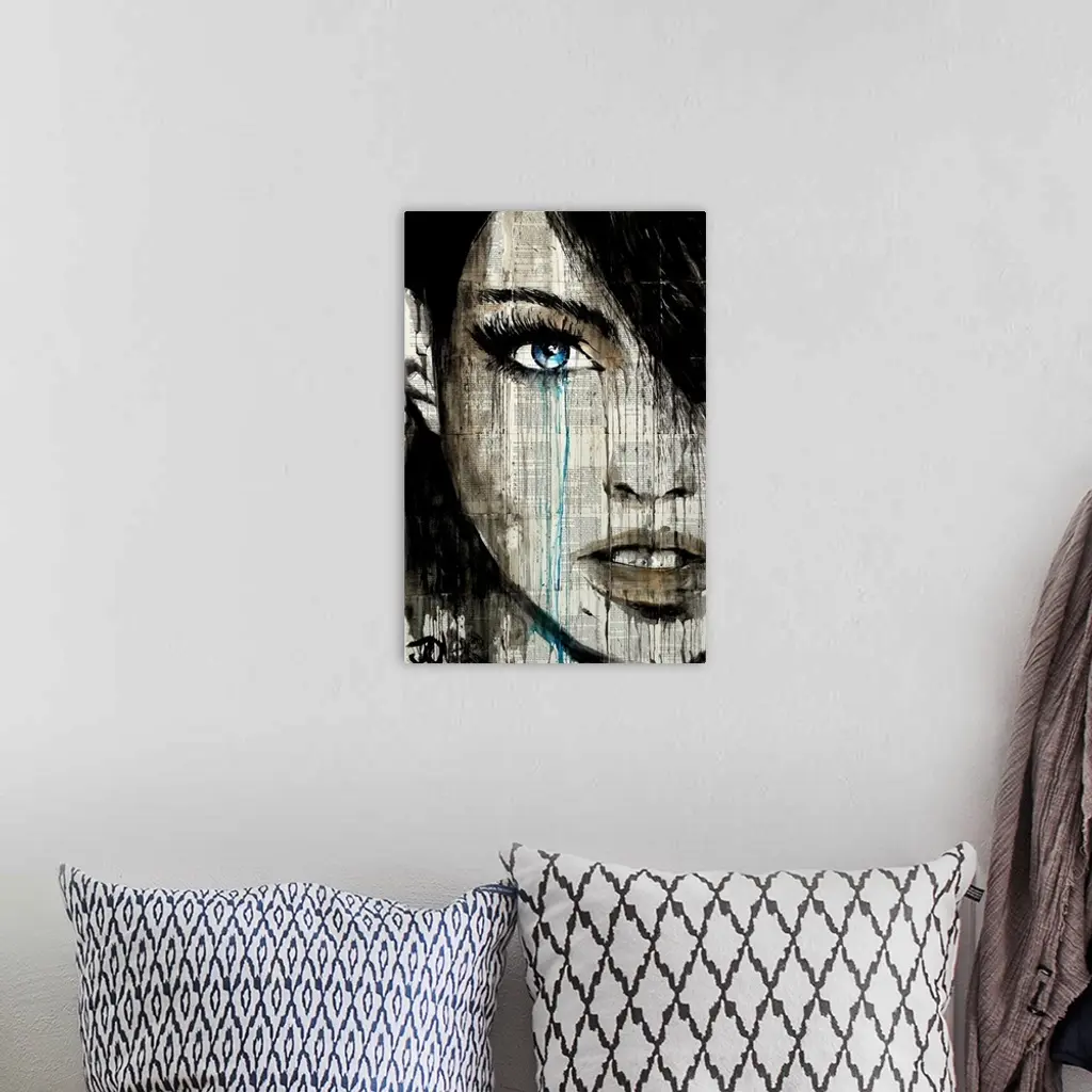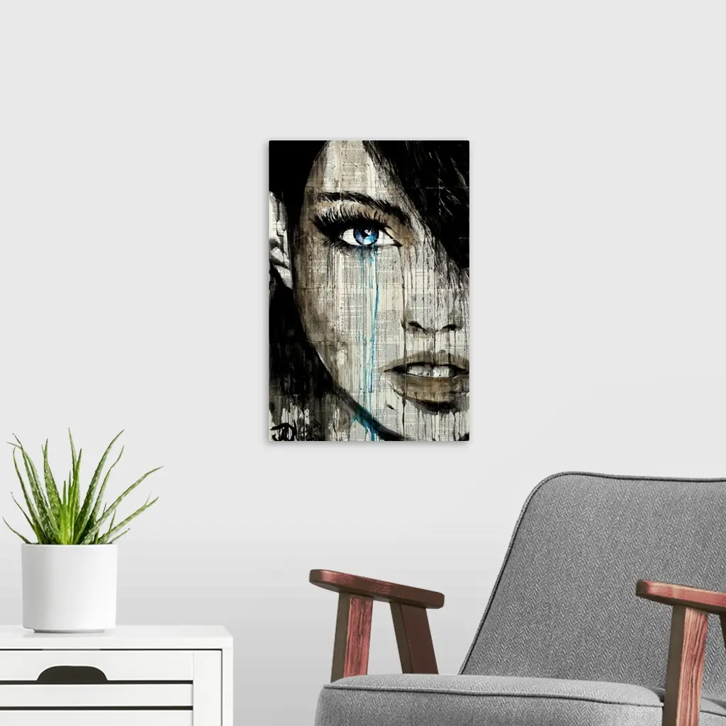 Contemporary artwork of a close-up of a woman's face with deep blue eyes against a background of tiled book pages.