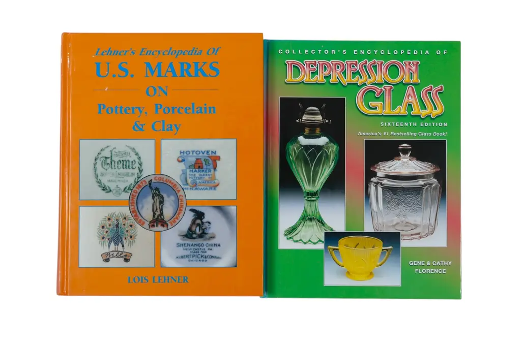 A set of five books on American pottery and glass. 1. Lehner's Encyclopedia of U.S. Marks on Pottery, Porcelain & Clay. 2. Collector's Encyclopedia of Depression Glass. 3. Frankoma and Other Oklahoma Potteries. 4. Depression Glass, a Collector's Guide. 5. Roseville Pottery.