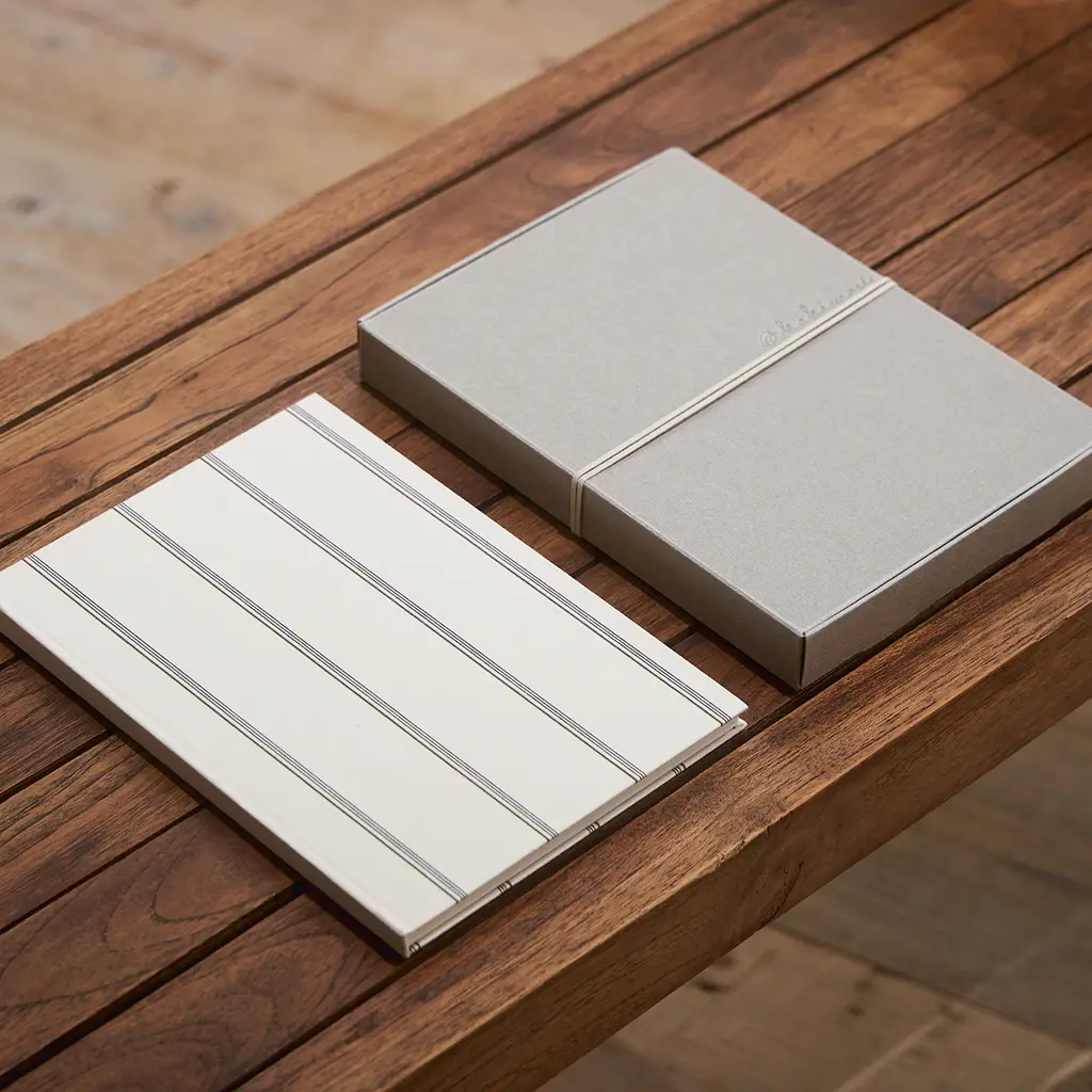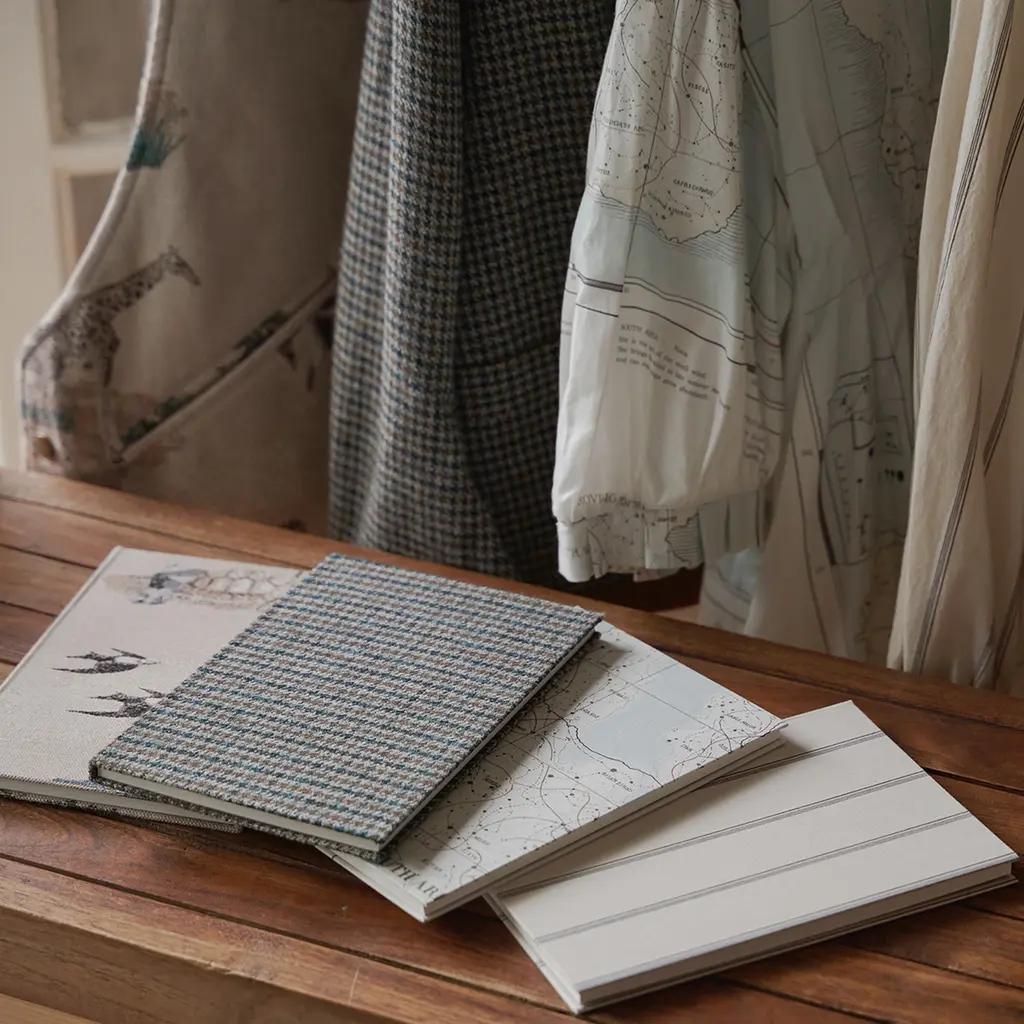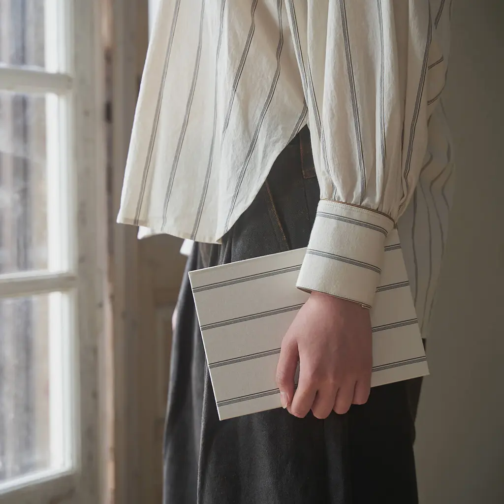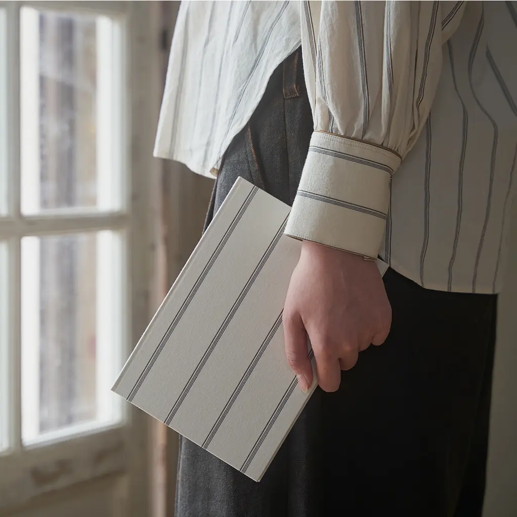 Bringing fashion into your writing routine, these notebooks are adorned with exclusive garment fabrics, combining style and functionality. With a lay-flat sewn binding and a durable hardcover, they’re designed for effortless writing, even on the go. This limited edition features original fabrics from Aseedonclöud by Kentaro Tamai. Inspired by the 2022 Autumn Kiokushi collection, which follows the journey of mapmakers cataloguing memories, the designs reflect a deep connection to storytelling and tradition. Inspired by the main character of the story, Zephyros, this fabric embodies the essence of his well-worn, cherished shirt. Crafted with a soft, lived-in texture, it mirrors the comfort and familiarity of a beloved garment.