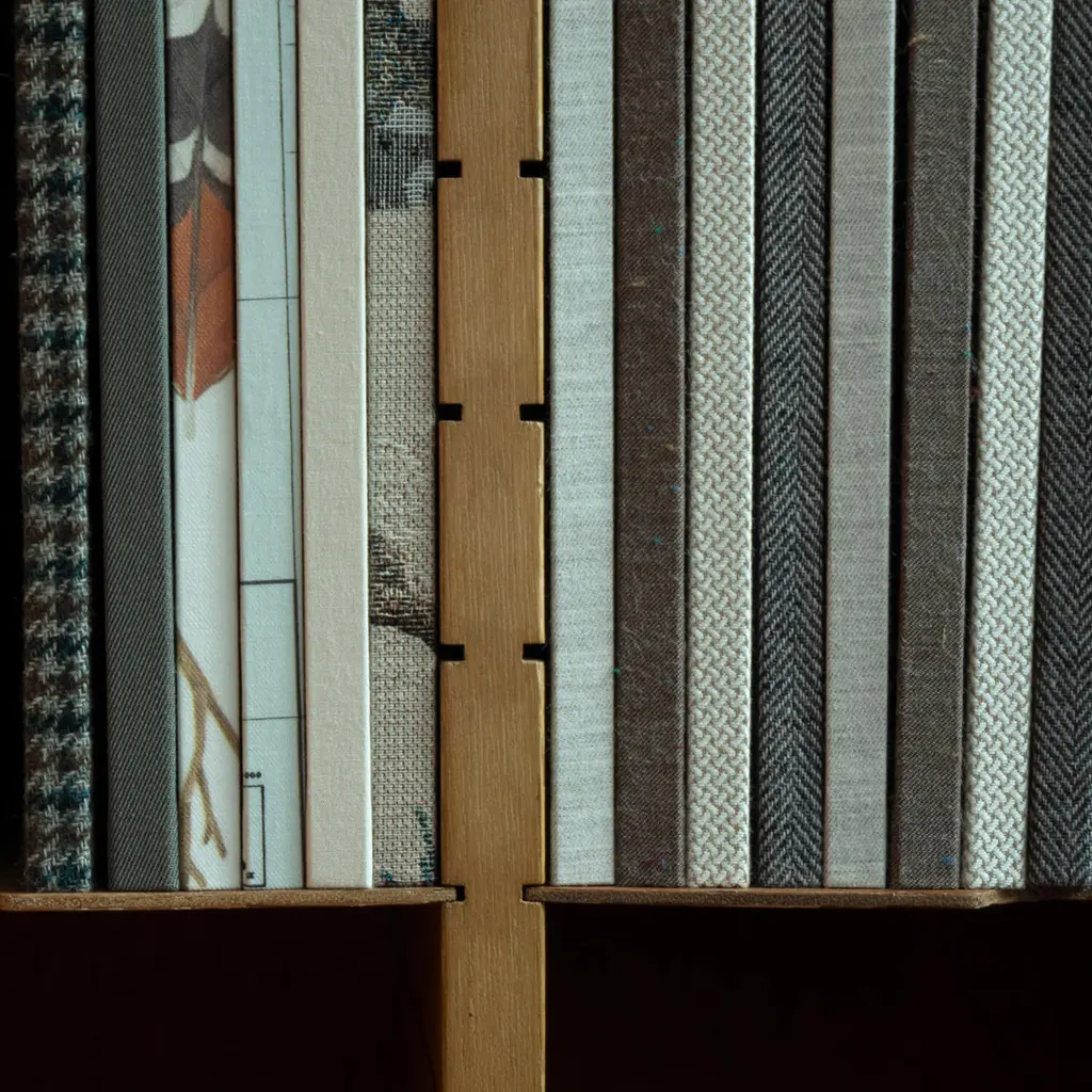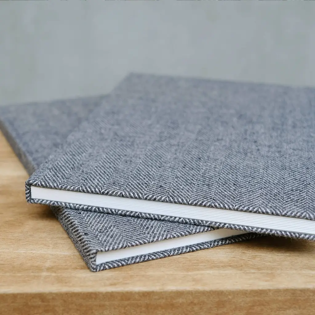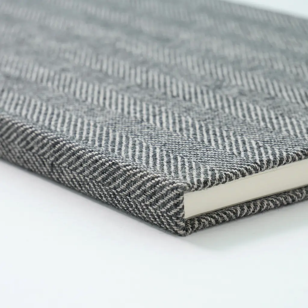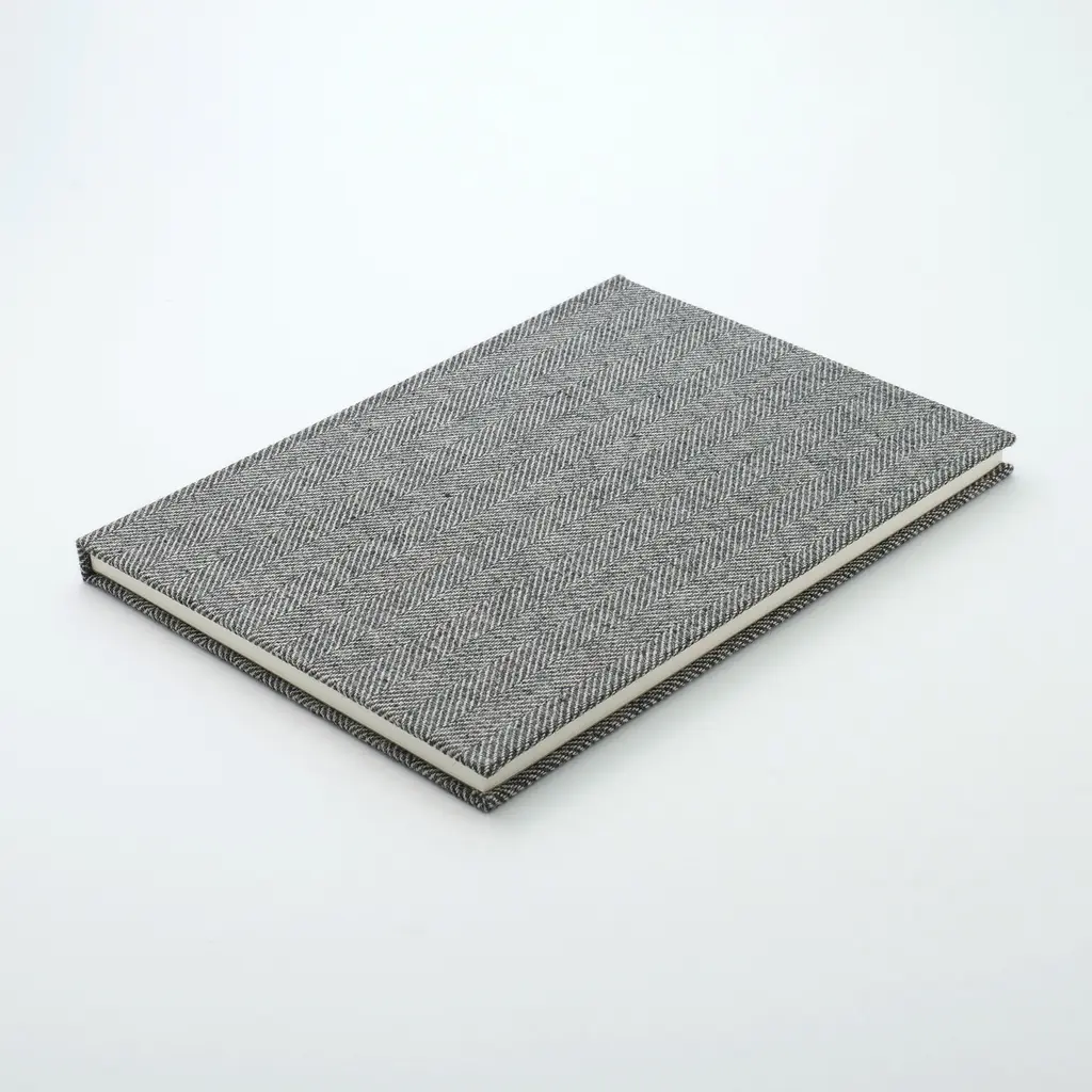 This hardcover notebook is designed for daily use and crafted to stand the test of time, making it a perfect addition to any collection. The cover features a premium fabric from Shimada Textiles, known for their traditional Banshu-ori textiles. Using the sakizome method, yarns are dyed prior to weaving, resulting in unique patterns and textures. The fabric itself is a sustainable blend, incorporating recycled polyester from plastic bottles and yarn spun from unused fibers and offcuts. These materials are carefully woven into a soft herringbone pattern that adds a layer of sophistication to the design. Combining durability, sustainability, and timeless style, this notebook is an ideal companion for preserving your thoughts, plans, and ideas.
