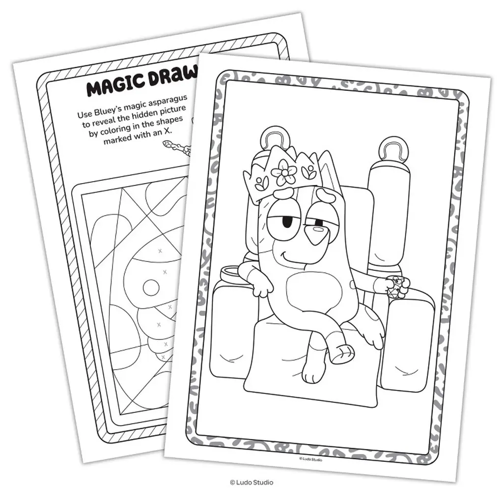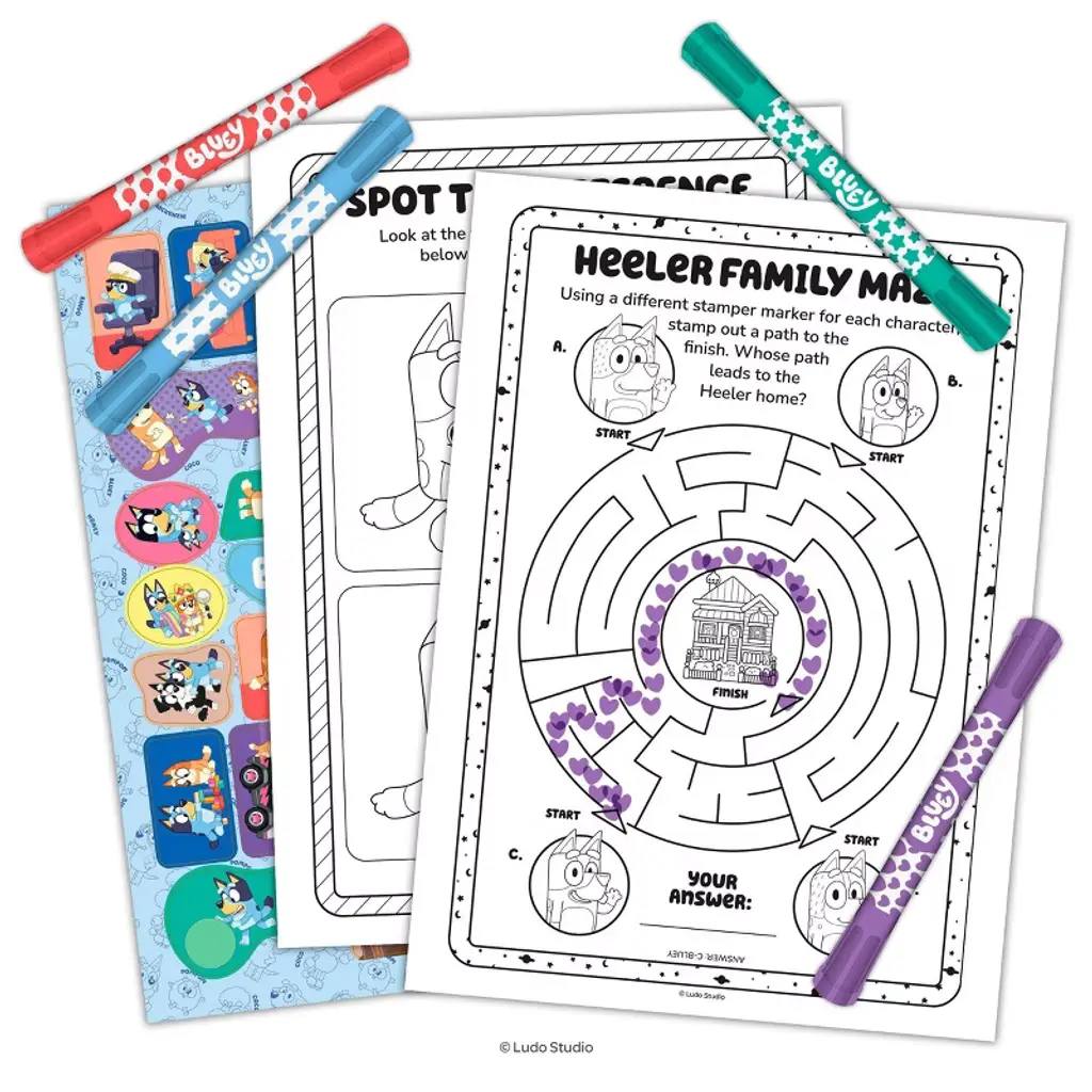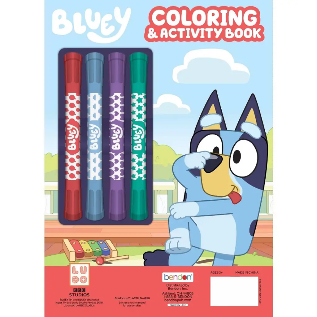 Color, sticker, and stamp with Bluey in Bendon's Bluey Coloring and Activity Book with Stamper Markers! This book is filled with coloring pages and fun stamper activities and games for hours of creative play. Use the perforated Tear and Share® pages to remove your page and display! The standard trim size for this coloring book is 7.75 inches by 10.75 inches.