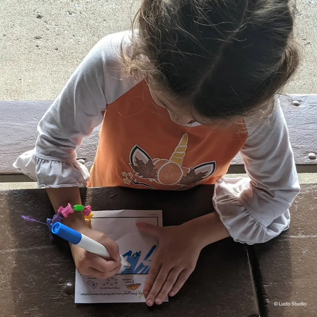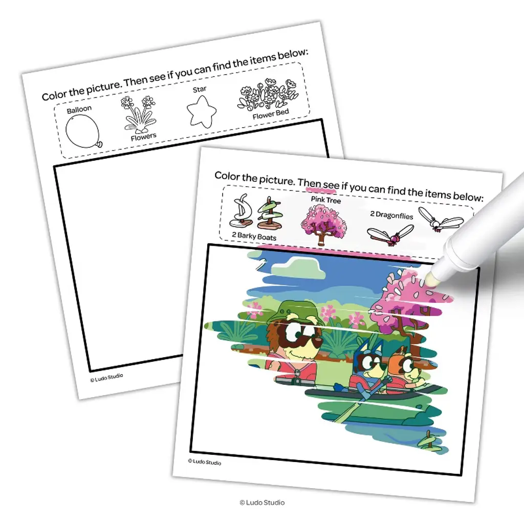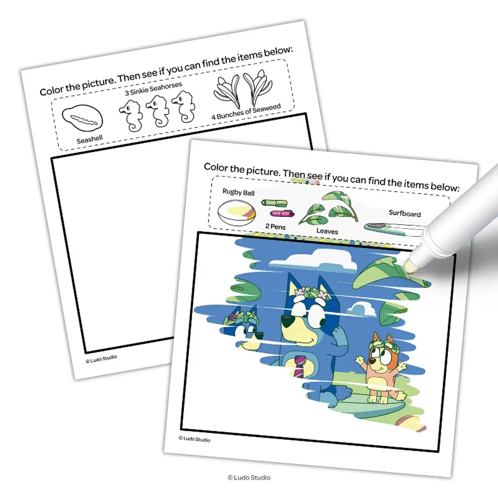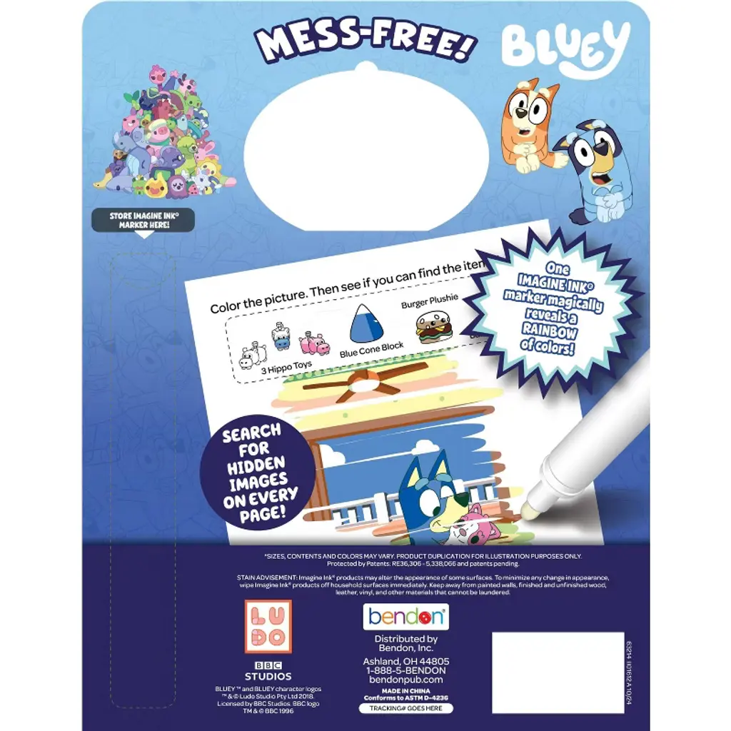 Reveal hidden images on every page with Bendon’s Bluey Imagine Ink® Magic Picture Find! This patented technology magically reveals a rainbow of colors with just one Magic Ink marker. Your little artist will love finding the objects and Bluey characters hidden on each page, and you'll love the magic of mess-free coloring! The standard trim size for this coloring book is 7 inches by 9 inches.