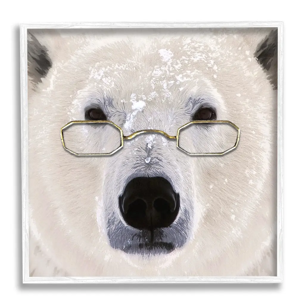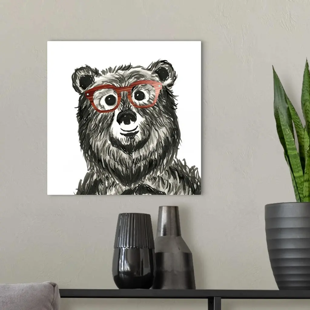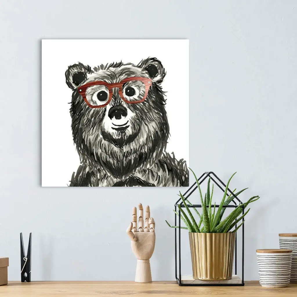 Black and white illustration of a whimsical bear wearing wood grain glasses on a square background.