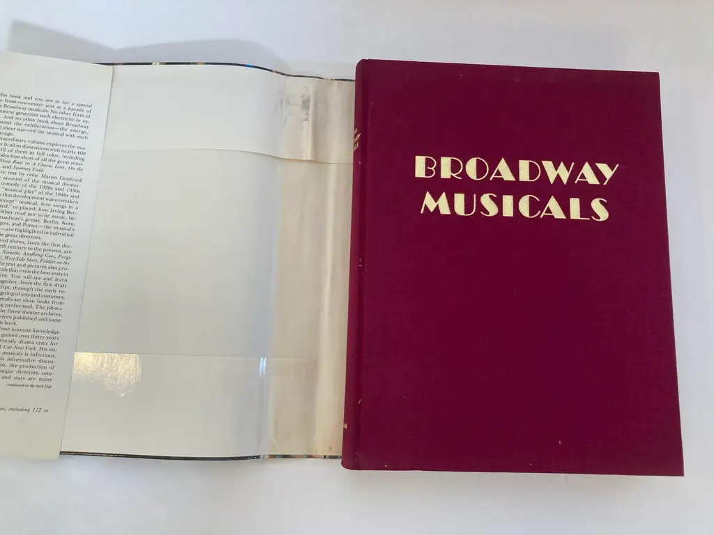 Broadway Musical Martin Gottfried 1979 hardcover book.Large heavy book. A colorful tribute to the great Broadway shows of our time. Profusely illustrated in color. New York: Harry N. Abrams, Inc, 1979 Title Broadway Musicals Author Gottfried, Martin Format/Binding Hardcover Edition 1st 1st Printing Binding Hardcover Publisher Harry N. Abrams Place Of Publication NY Date Published 1979 395 illustrations, 112 in full color. Great oversized heavy coffee table art book. A true treasure of a book. This is a very large book, and not just width wise. It is very tall too. There are many pictures, a lot of them in color. They have some of the rarest flops featured toward the back of the book, and the classics are all here too. Some high points are the run-through of how they make (made) "Annie" run every night. There is also a synopsis of "Hello Dolly" which helpful since I have only seen the movie. There is a flaw though, and it is not insignificant. The author does not separate fact from opinion. Example: "Sweeney Todd does not hold a place in the theater". This book came out the same year "Sweeney Todd" did(1979), so it might be just a bit early to say that. Obviously, he is a critic, but he should have took that hat off ,and taken on the role of an author who looks at the facts.("Sweeney" is just one of the hows that gets criticized.) Colorful entertaining masterpiece with many of these Broadway Musicals some of them are THE WIZ, SOPHISTICATED LADIES, DREAMGIRLS, AIN'T MISBEHAVIN, PIPPIN, SUGARBABIES, FORTY-SECOND STREET ON PAGE 145, A CHORUS LINE ON PAGES 138-139, EVITA PAGE 127, DANCIN PAGES 122-123, ON THE TWENTIETH CENTURY PAGES 72-81, and remade versions of WEST SIDE STORY, OKLAHOMA, BRIGADOON, AND GUYS AND DOLLS. Full of information and pictures.