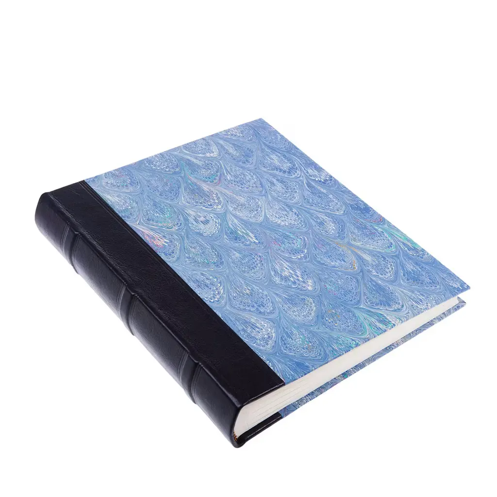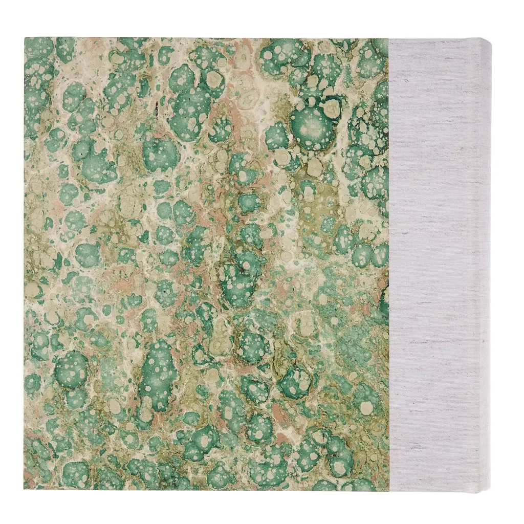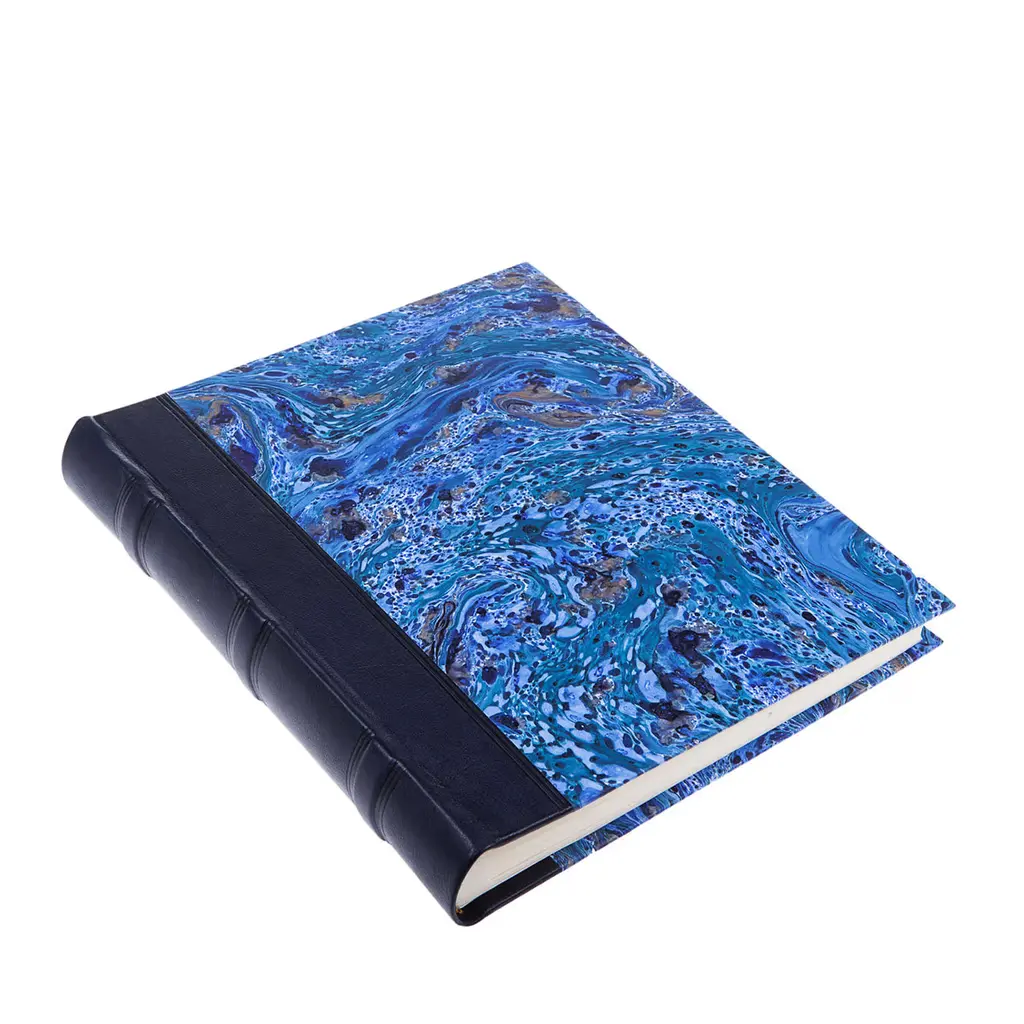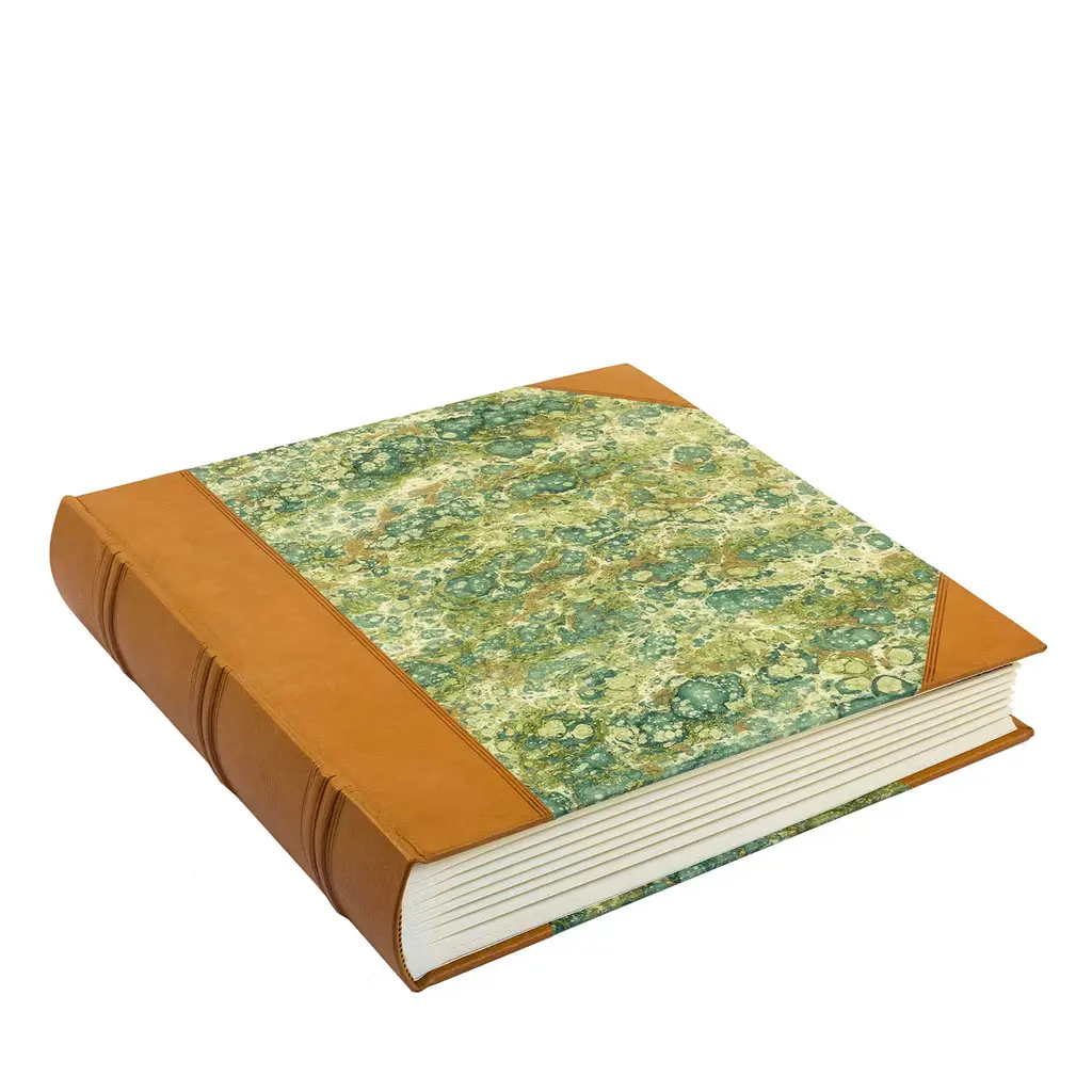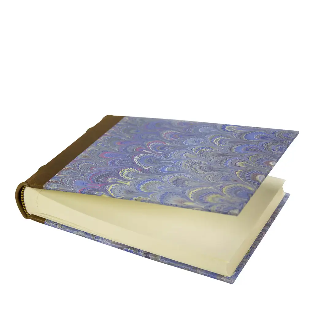 This is a photo album of canvas and marbled paper decorated by hand by the artisans of the Florentine bookbinders Giannini. Inside, card pages are separated by tissue paper. At the request of the client, the rear cover can be etched in gold on a leather label.