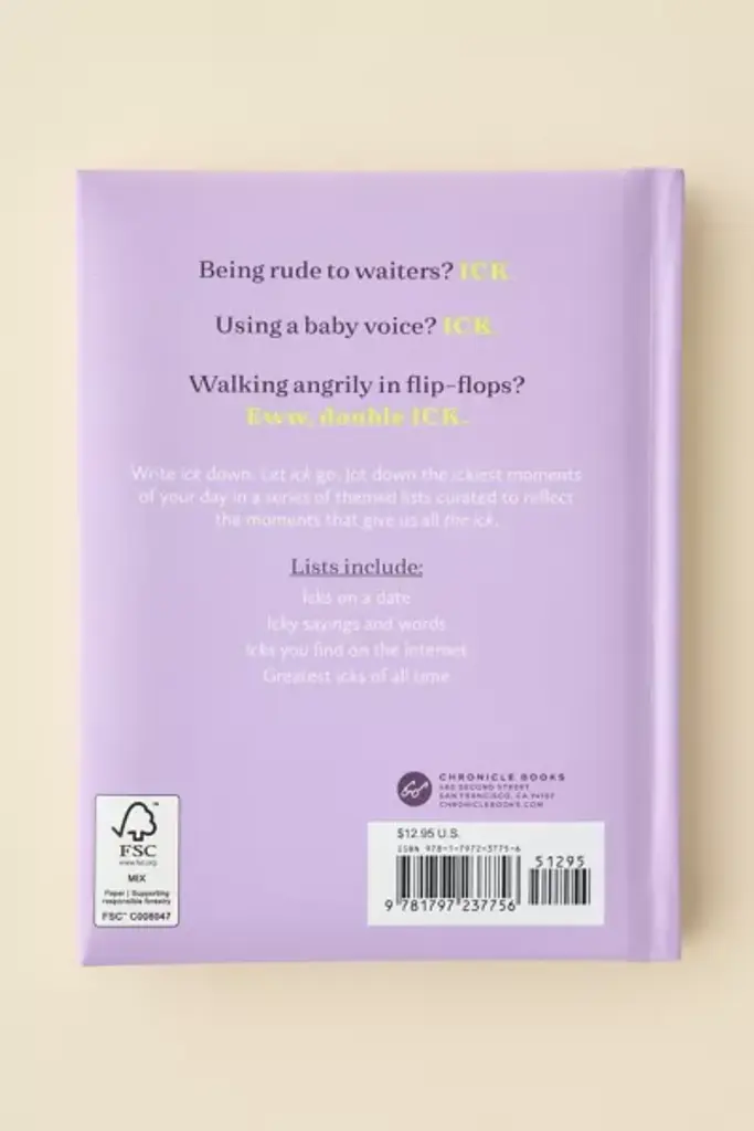 A guided journal designed to help you revel in your disgust, this hardcover journal features guided prompts that act as a nonjudgemental outlet for getting out your grievances about your partner, coworker, neighbor, or anyone or anything else that gives you the ick. **Features** \- Chronicle Books Ick Journal \- Hardcover guided journal \- Guided prompts to explore & reflect on all your grievances \- Perfect for gifting **Content + Care** \- Paper \- Wipe clean \- Imported **Size** \- Dimensions: 6"l x 4.5"w x 0.9"h \- Weight: 0.5 lbs