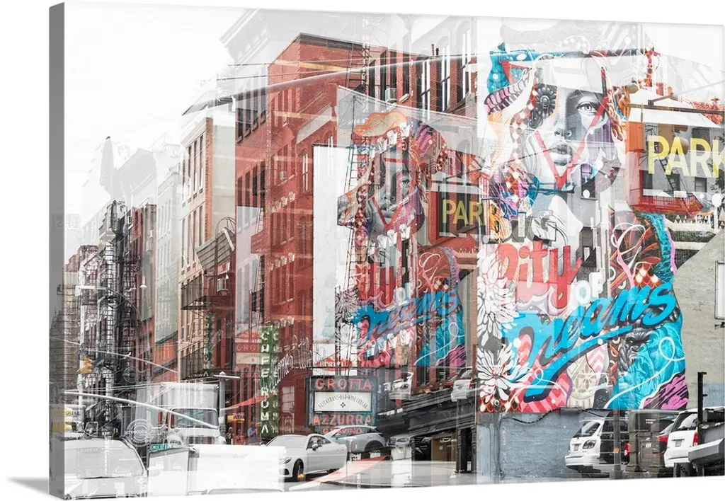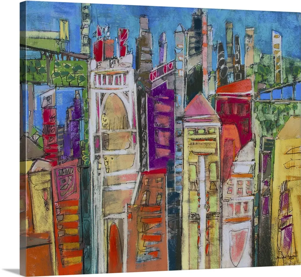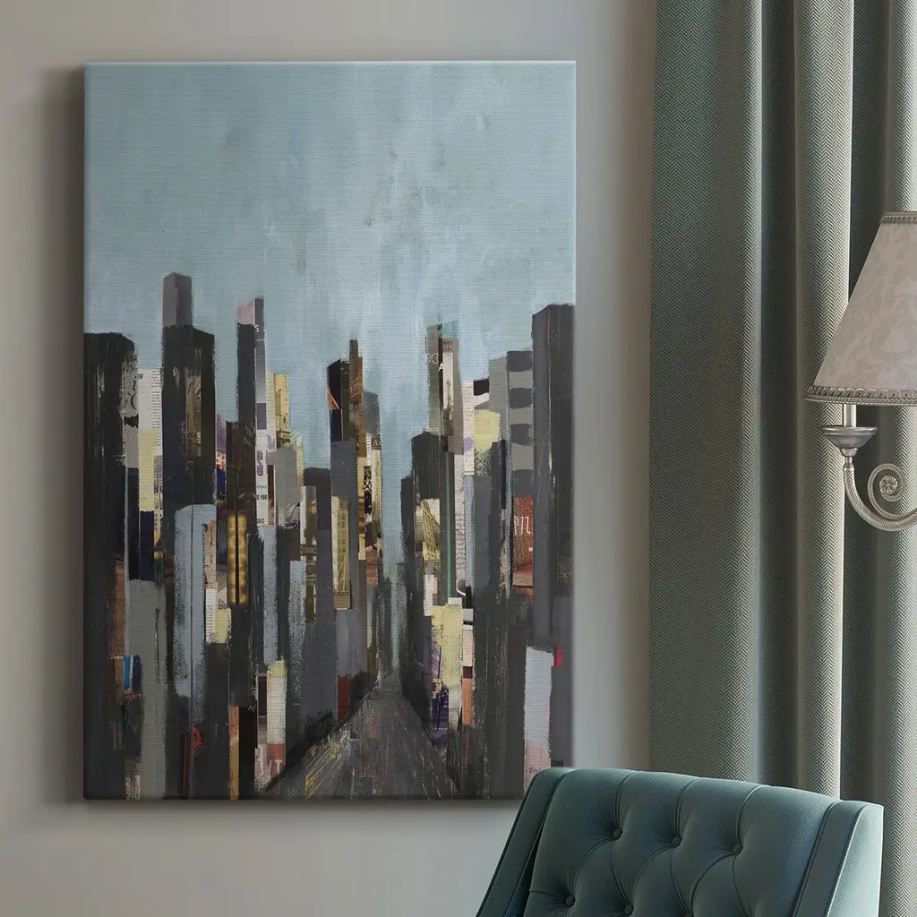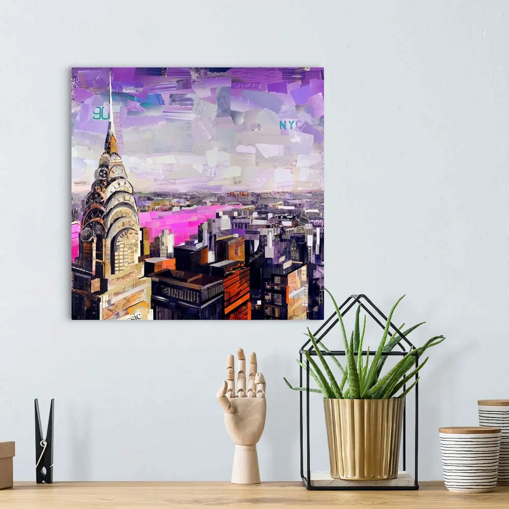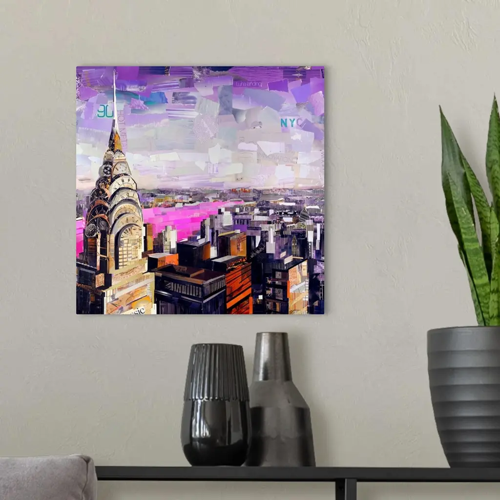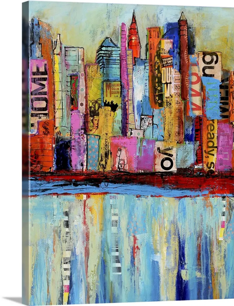 Mixed media artwork of a cityscape of New York City made from cut magazine and book pages.