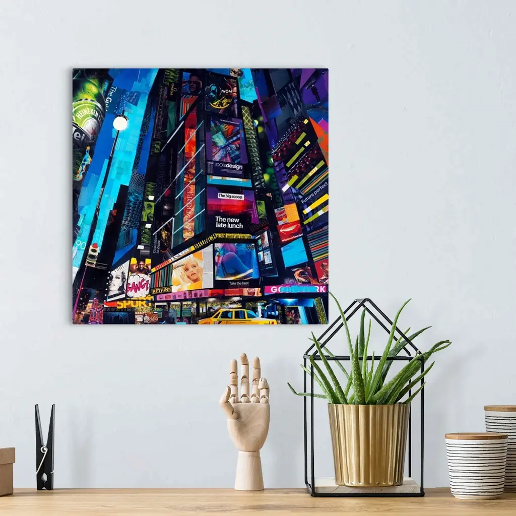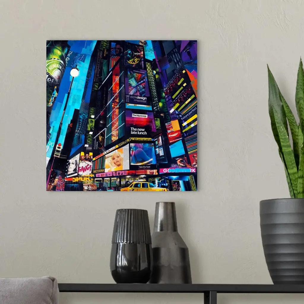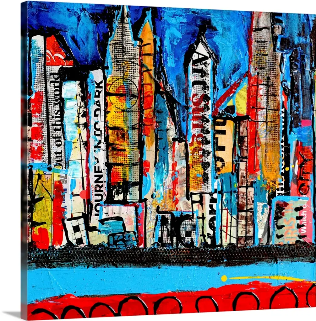 Mixed media artwork of a cityscape of New York City made from cut magazine and book pages.