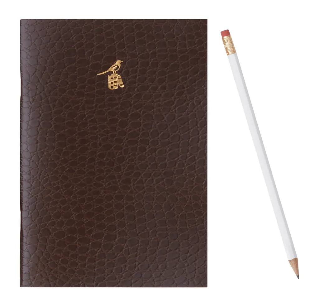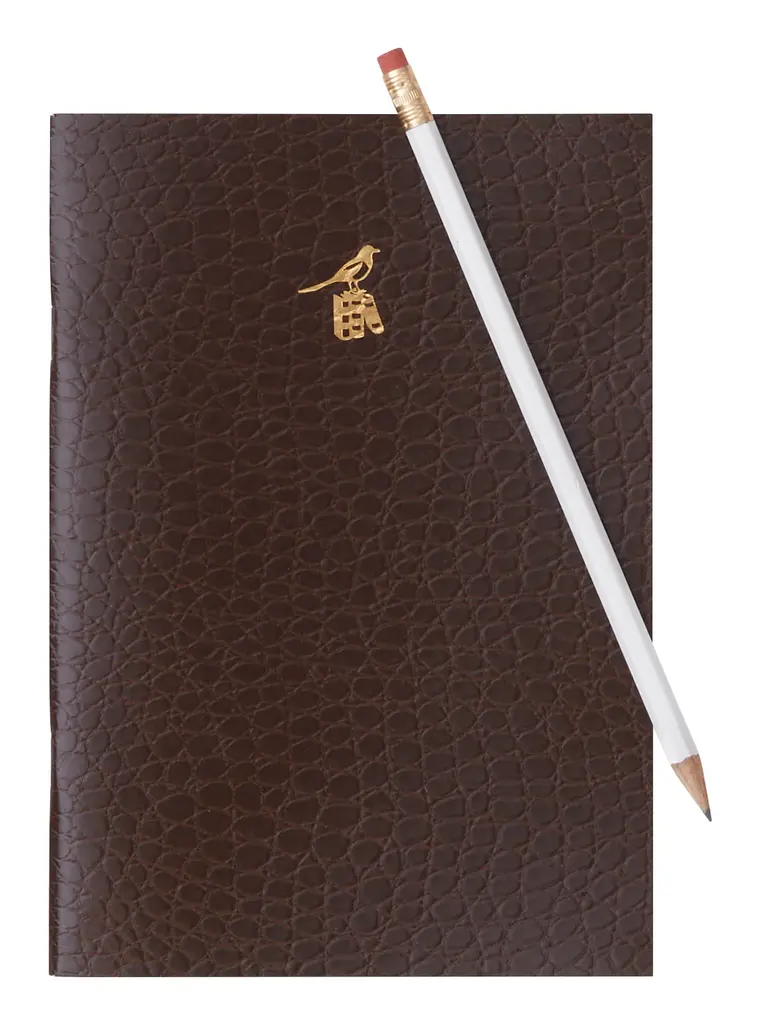 Bring a vintage feel to your daily journaling with our Crocodile Notebook. This soft-cover journal was handcrafted in Italy by the old-school stationery maker Bieffe Roma following classic techniques that date back to the early 1900s. Each one features sixty-four pages of lined, cream-colored paper with finger-dabbed red edges and a hand-bound leather cover in brown crocodile-embossed leather, finished with a gold foil emblem of a hooded crow (a common sight around the city of Rome) perched atop a row of books. A handsome addition to any desktop, our Crocodile Notebook is also perfect for slipping into a tote or purse for jotting down thoughts and ideas on-the-go. •64 lined pages •brown leather cover •gold embossed details•hand-bound•made in italy Dimensions: •5.5"W x 8"H