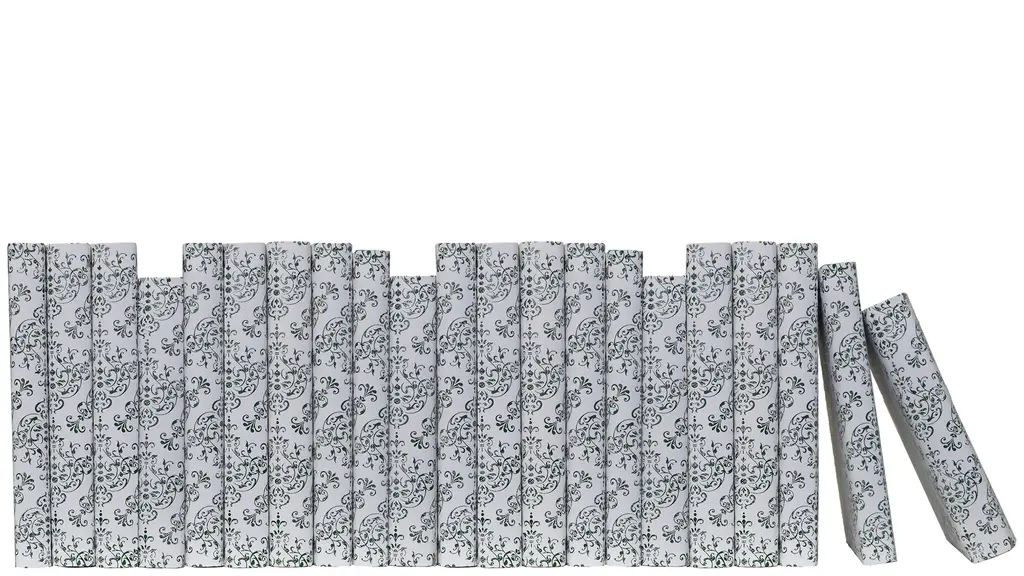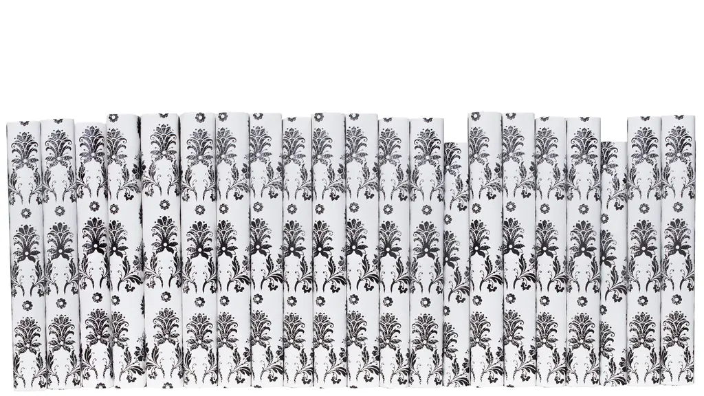 Take your design to a new level with Onyx & White Demask Wrapped Color By The Foot from Booth & Williams. Featuring one linear foot of authentic modern hardback books wrapped in a onyx black mixed with a complementary black and white demask patterned paper. Contains 10-12 books with an average height of 9.5-10”. Order as many linear feet as you need to complete your project.