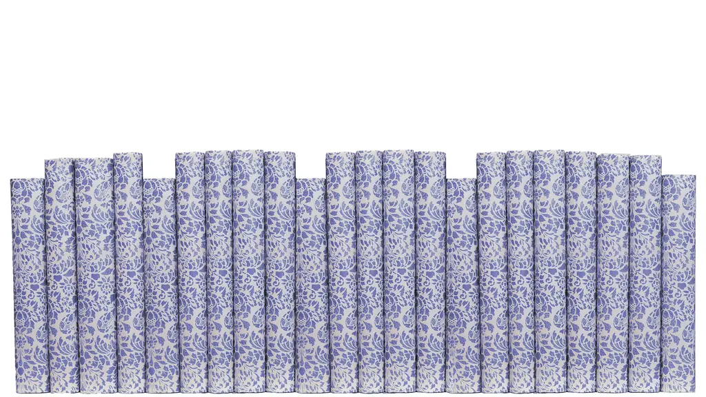 Take your design to a new level with Very Peri Demask Wrapped Color By The Foot from Booth & Williams. Featuring one linear foot of authentic modern hardback books wrapped in a blue infused purple demask patterned paper. All books are published 1980-present and include a variety of literary works, period novels and topical texts with light overall wear. Contains 10-12 books with an average height of 9.5-10”. Order as many linear feet as you need to complete your project.