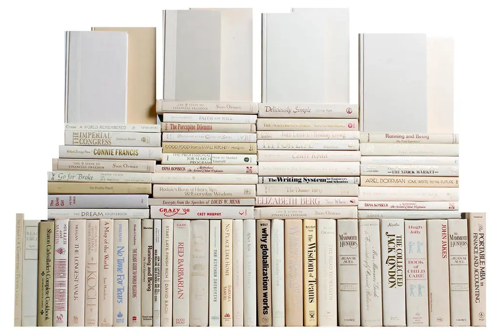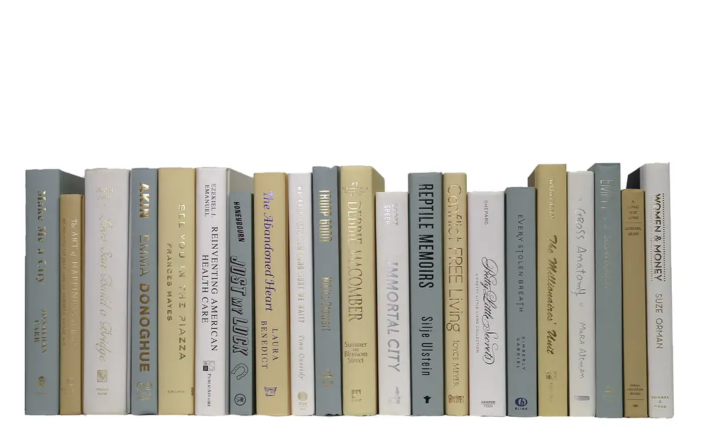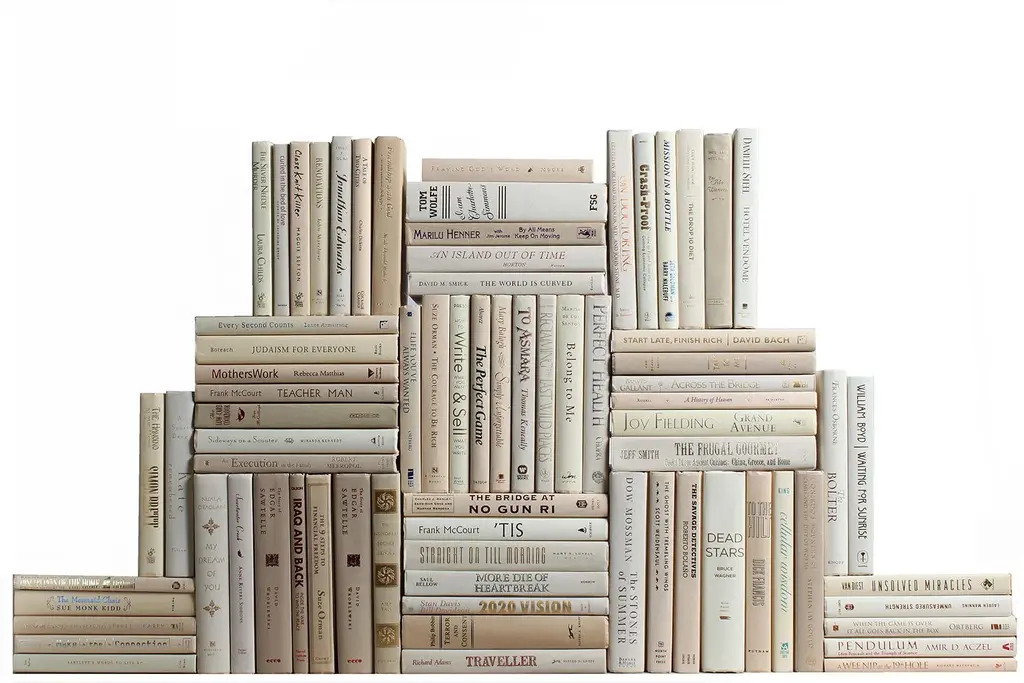 Take your design to a new level with the Modern Beach Book Wall S/75 from Booth & Williams. Seventy-five authentic modern hardback books in crisp shades of off-white. All books are published 1980-present and include a variety of literary works, period novels and topical texts with light overall wear. Books total approximately 7.5 linear feet with an average height of 8.5-9.5". Actual titles will vary from those pictured but will remain the same color pattern. Book titles could be repeated after three linear feet.