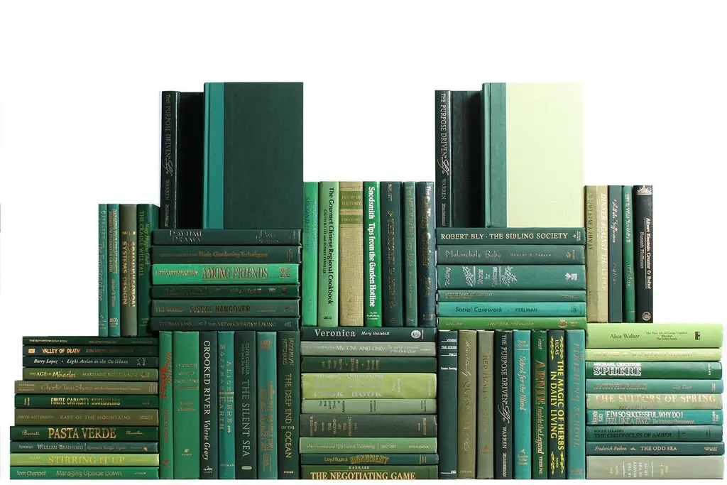 Take your design to a new level with the Modern Boxwood Book Wall S/75 from Booth & Williams. Seventy-five (75) authentic modern hardback books in crisp shades of medium and dark green. All books are published 1980-present and include a variety of literary works, period novels and topical texts with light overall wear. Books total approximately 7.5 linear feet with an average height of 8.5-9.5". ACTUAL TITLES WILL VARY FROM THOSE PICTURED BUT WILL MAINTAIN THE SAME COLOR PATTERN.