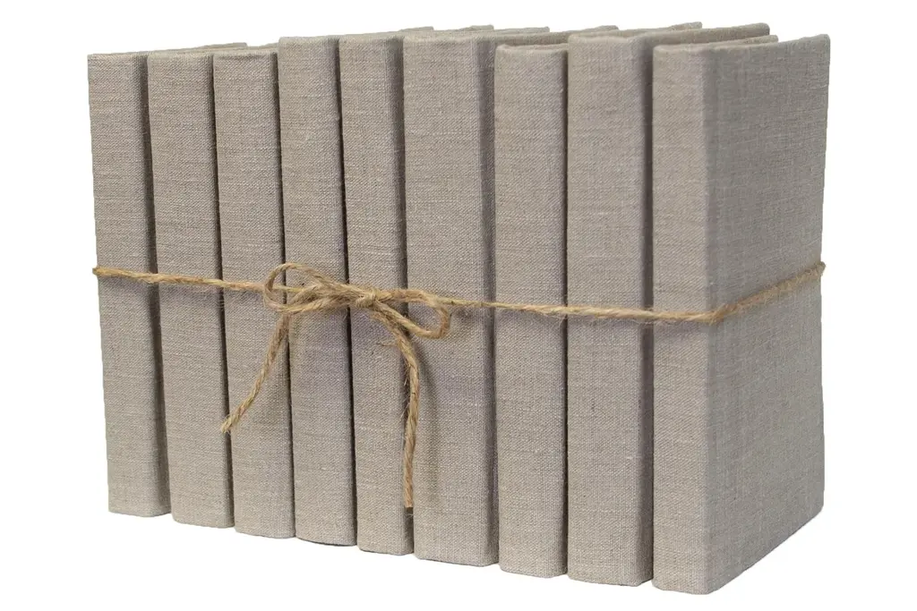 Transform your space with our Driftwood Linen Wrapped ColorPak from Booth and Williams. One linear foot of authentic modern hardback books hand wrapped in a muted tan linen fabric that is precisely attached to each individual book's cover. Contains 7-12 books with an average height of 9.5-10” and hand-wrapped in jute twine. Made to order-allow 3-5 business days before shipment.