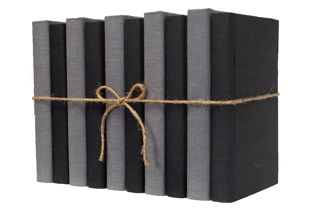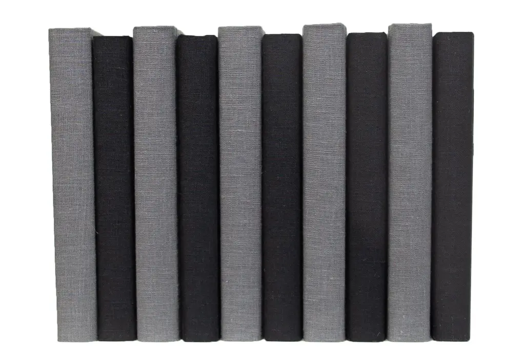 Transform your space with our Onyx & Slate Linen Wrapped ColorPak from Booth and Williams. One linear foot of authentic modern hardback books hand wrapped in varied shades of black and heather grey linen fabric that is precisely attached to each individual book's cover. Contains 7-12 books with an average height of 9.5-10” and hand-wrapped in jute twine. Order as many ColorPaks as needed to complete your project. Made to order-allow 3-5 business days before shipment.