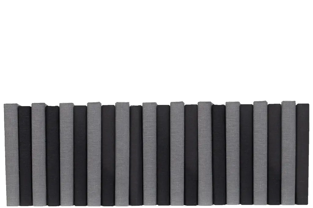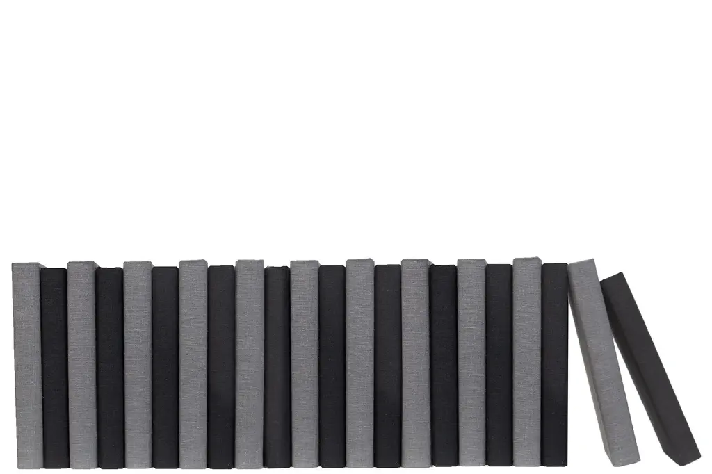 Transform your space with our Onyx & Slate Linen Wrapped Color By The Foot from Booth and Williams. One linear foot of authentic modern hardback books hand wrapped in varied shades of black and heather grey linen fabric that is precisely attached to each individual book's cover. Contains 7-12 books with an average height of 9.5-10”. Order as many linear feet as needed to complete your project. Made to order-allow 3-5 business days before shipment.