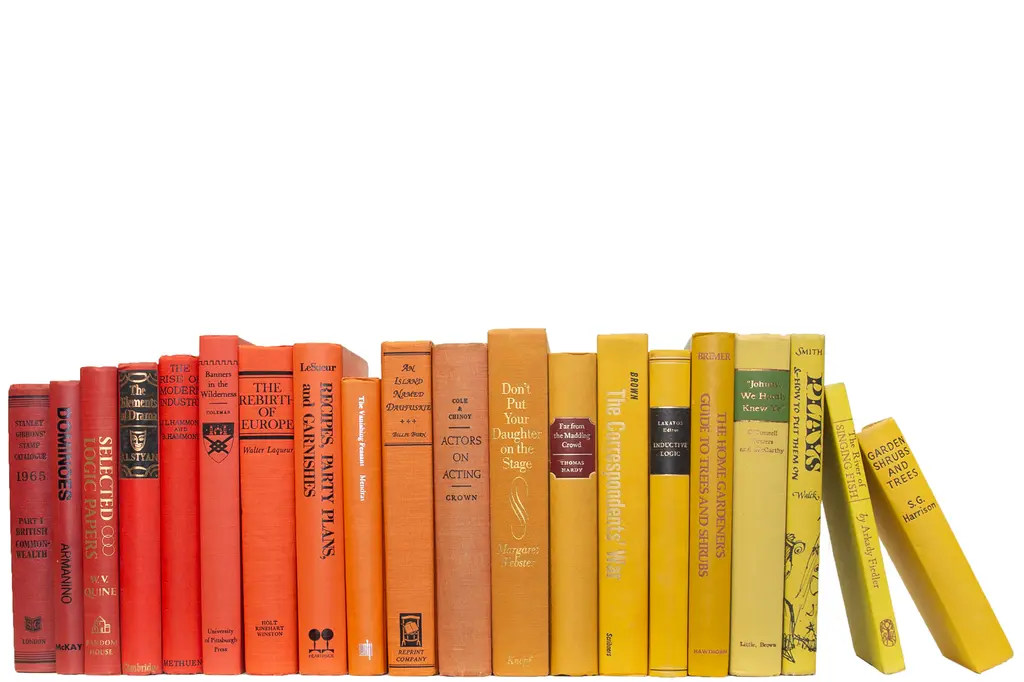 Take your design to a new level with the Vintage Sienna Color By The Foot from Booth & Williams. One linear foot of authentic vintage hardback books in blended shades of warm orange and brown. All books are published 1900-1969 and include a variety of literary works, period novels and topical texts with light overall wear. Contains 10-12 books with an average height of 8.5-9.5". Order as many linear feet as you need to complete your project. Titles will differ from those pictured.
