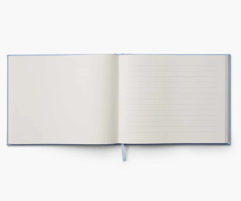A one-of-a-kind keepsake, our new embroidered guest book is a large hardcover journal with 144 interior pages, half lined and half blank so guests can write a note, add a sketch, or paste a photo. The cover is wrapped in book cloth and embroidered with dotted Hydrangea florals and metallic gold accents. A grosgrain ribbon bookmark saves your place.