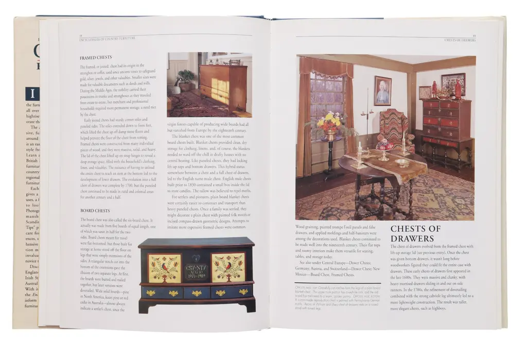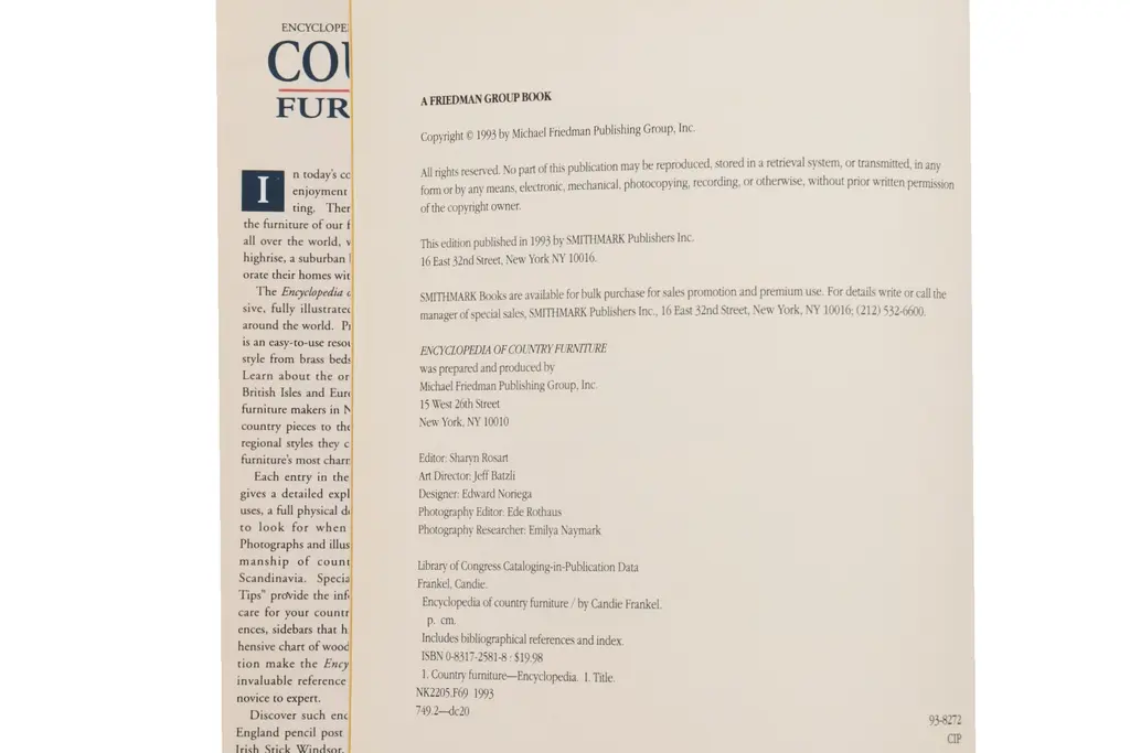 Encyclopedia of Country Furniture by Candie Frankel. Hardcover book with dustjacket, published in 1993 by Smithmark Publishers Inc of New York. Illustrated, 193 pages.