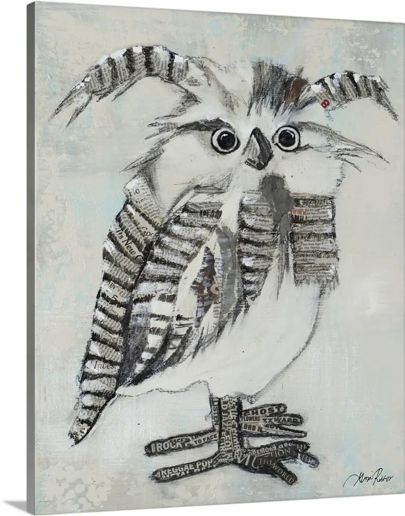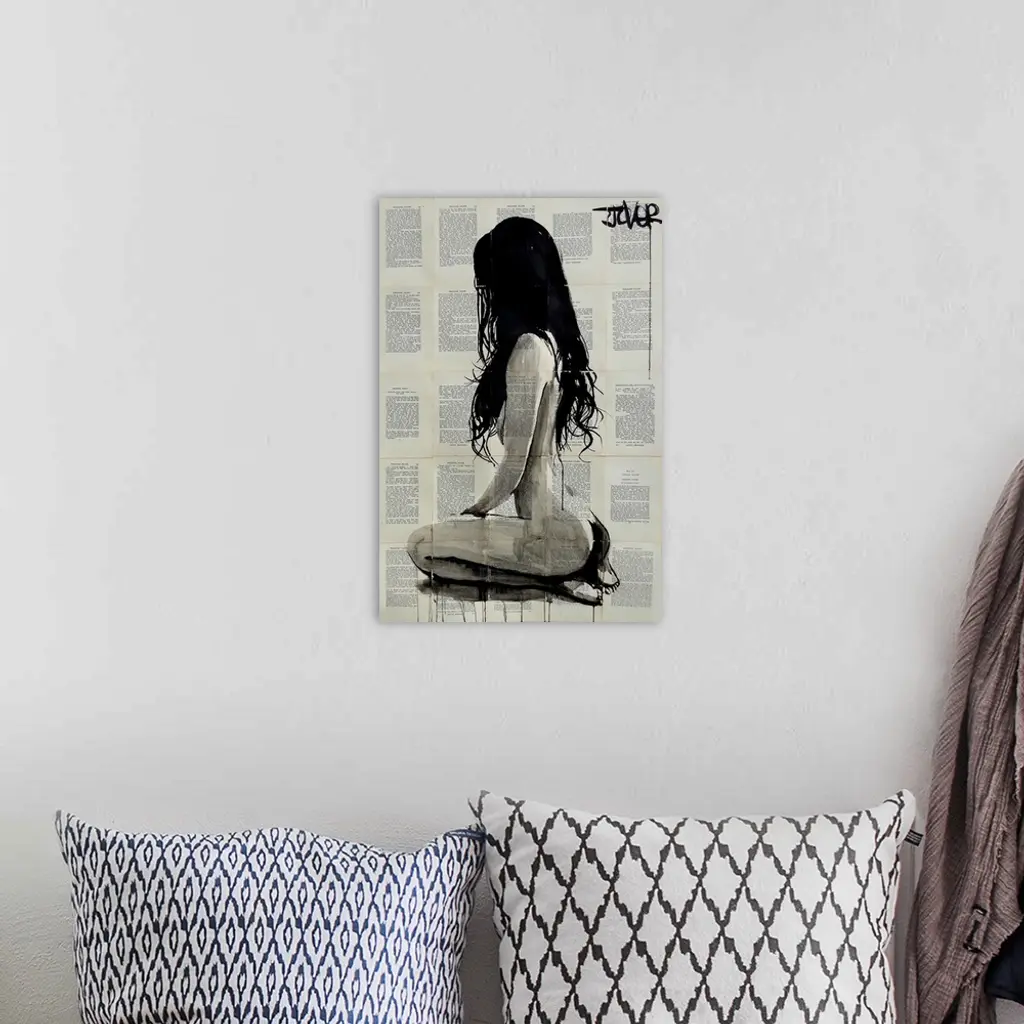 Contemporary urban artwork of a nude woman seated against a background of tiled book pages.