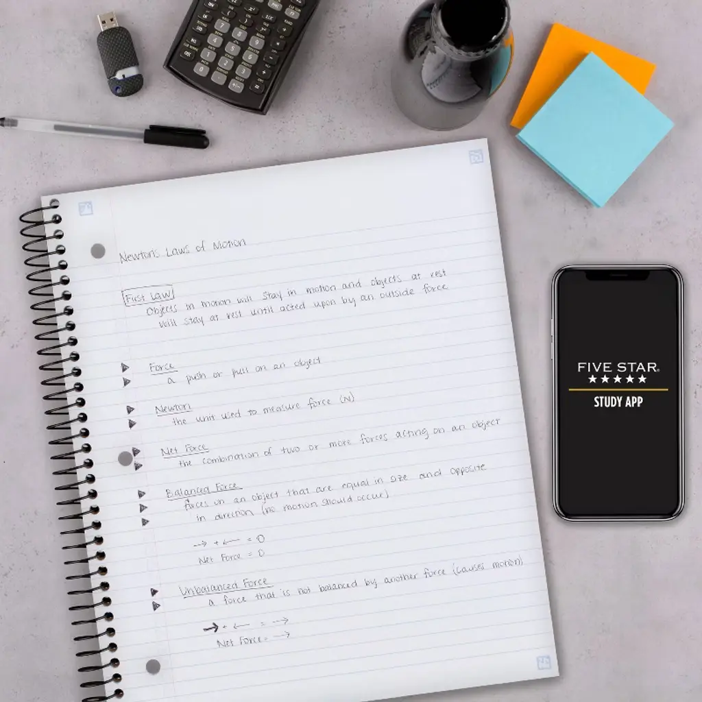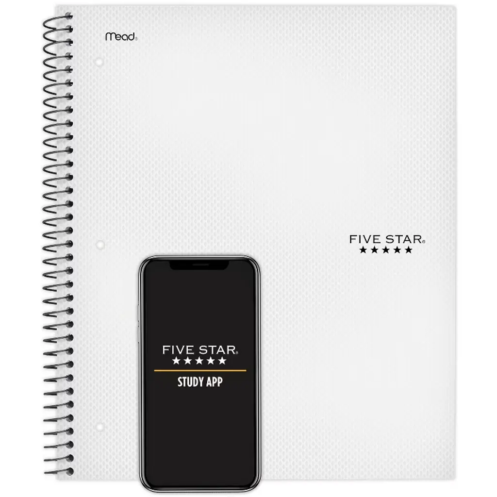 LASTS ALL YEAR. GUARANTEED!* This Five Star® Notebook Plus Study App is full of features. Compatible with the Five Star Study App, you can easily scan, study and organize notes on your phone! Create instant flashcards and sync notes to Google Drive and access them anywhere. Notebook has 130 double-sided, college ruled sheets, which fight ink bleed, plus a 2-pocket divider holds 8 1/2" x 11" sheets. Comes with Spiral Lock® wire binding, which helps prevent snags, movable tabbed dividers to create your own subjects and a movable ruler. Available in White. *Guarantee is valid for one year from purchase date. Does not cover misuse.
