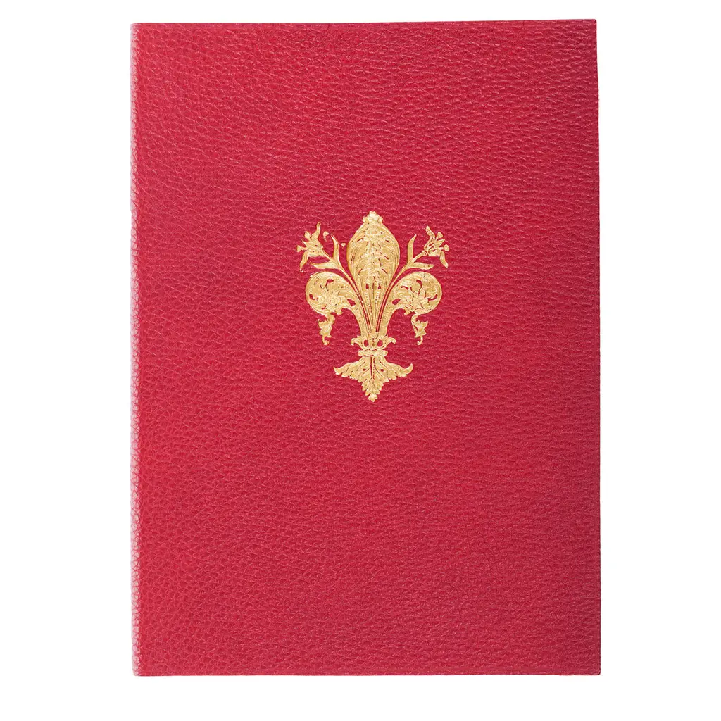 Elegant notebook in soft red leather treated with the technique of vegetable tanning. It contains ivory pages hand decorated with marbling by 6th generation bookbinding artisans Giannini. The cover is engraved with a gold lily of Florence. The book can be customized with a variety of monograms and engravings, as shown in the pictures. Please select the “Please contact me to discuss available options” button during the checkout process, in the “Shipping” section, and our concierge team will contact you immediately to customize your book.