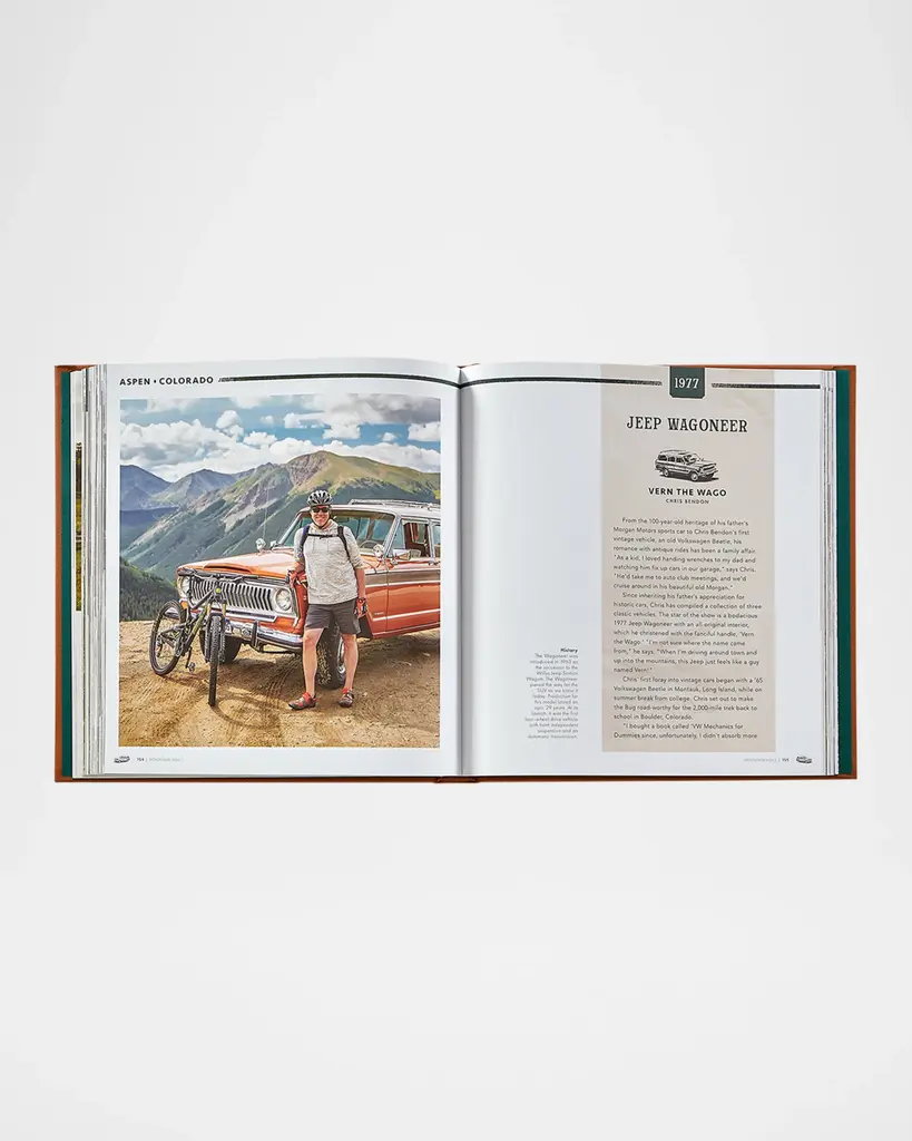 Hop in shotgun and travel back to the analog era through the pages of Mountain Rides : a unique photographic storytelling of 20 vintage 4x4s and the people to keep them alive. Starting with vehicles from the 1940s, the stories are organized by decade of car and showcase all the classics: Scouts, FJs, Wagoneers, Broncos, Fords, and CJs; to name a few. These iconic cars reveal intimate family memories and offer a rare glimpse into the carefully guarded, tight-knit mountain towns of the West Aspen, Crested Butte, Jackson Hole, and many more. With a timeless design aesthetic and premium print quality, this work of art makes for the perfect coffee table decor. Details: Leather-bound hardcover book Author: Johnny Vacay 258 pages Approx. 11"L x 10.25"W x 1.2"D Made in USA from imported materials Shipping Direct from Vendor, usually ships within 7 business days. undefined