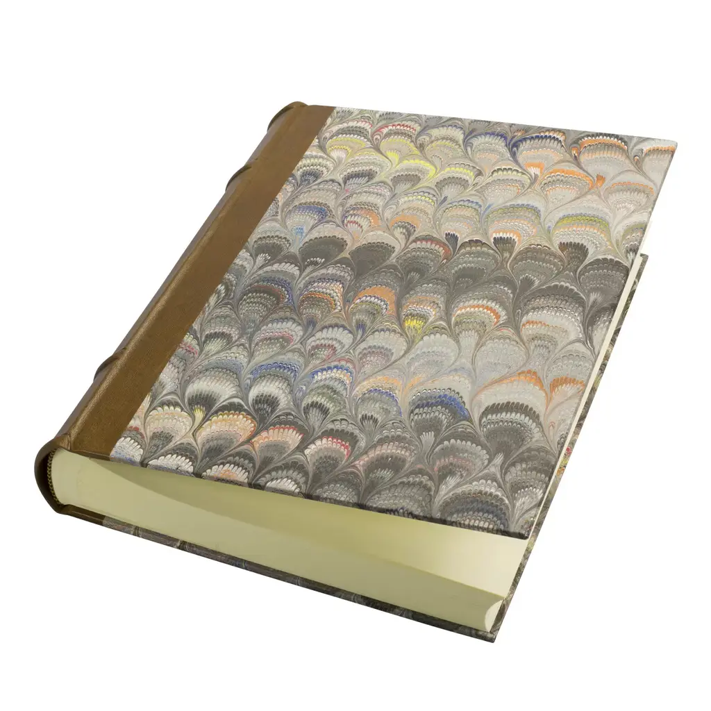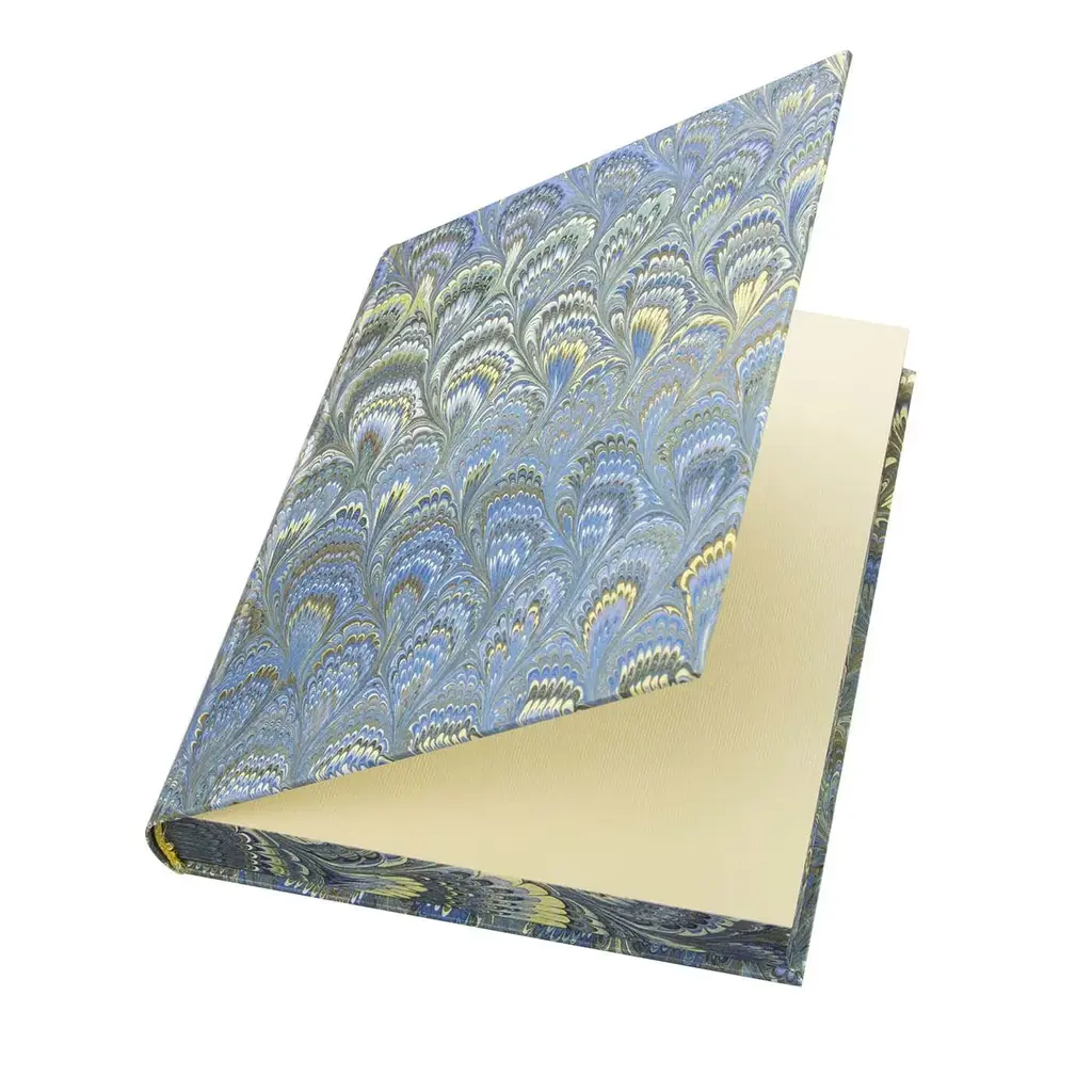 A stylish object to gather important thoughts or special projects, this exclusive notebook has 160 blank pages with a unique marble-like effect and a stunning motif inspired by the lines and vibrant colors of peacock tails - ranging from gray to blue. The same stunning pattern is executed by hand, lending a subtle yet timeless dynamism to the book's hard cover.